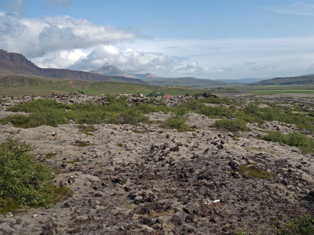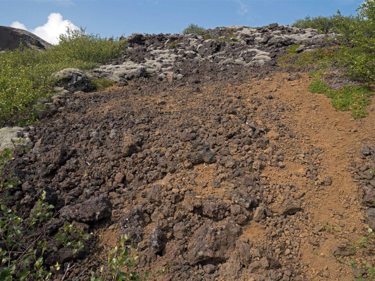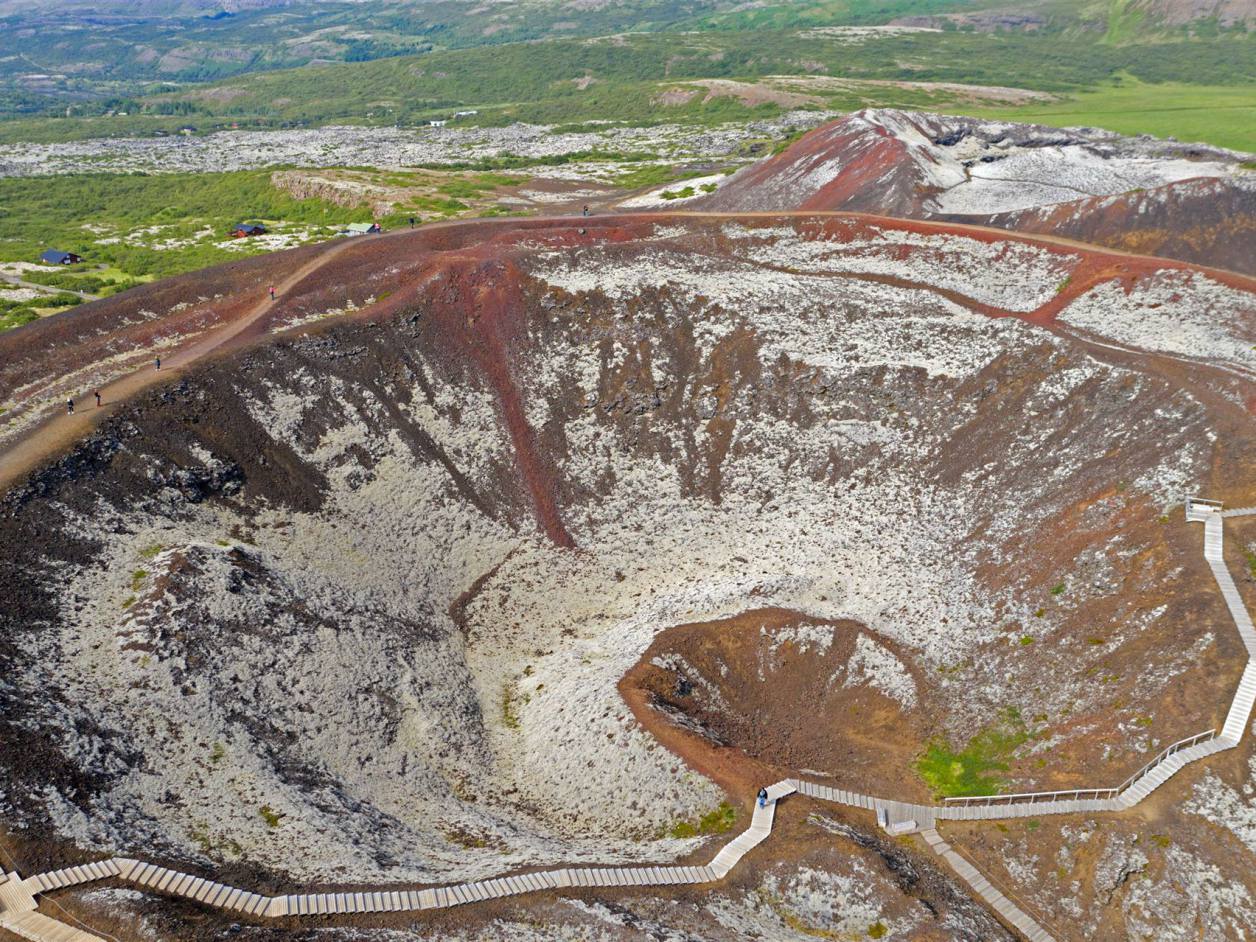 Der Krater ist bewachsen von farbenfrohem Moos und Flechten und auch wenn der Aufstieg etwas steil ist, lohnt sich der kurze Kraftakt auf jeden Fall. Von oben bietet sich ein super Blick über die anderen Krater, das "Universitätsgelände" und die restliche Busch- und Berglandschaft des Gebietes. In der Regel ist es hier recht ruhig und nur ein paar Reisende verirren sich entlang der Stufen. Der Pfad führt in 170 Meter Höhe einmal entlang des Kraters und ich kann diesen Rundgang nur empfehlen. Der isländische Wind kann einen hier zwar ganz schön durchpfeifen, die Szenerie lässt einen die Weite der Landschaft jedoch eindrucksvoll spüren und begeistert mich. Entstanden ist dieser sogenannte Schlackenvulkan vor etwa 3.600 Jahren und steht seit den 1960er Jahren unter Naturschutz.