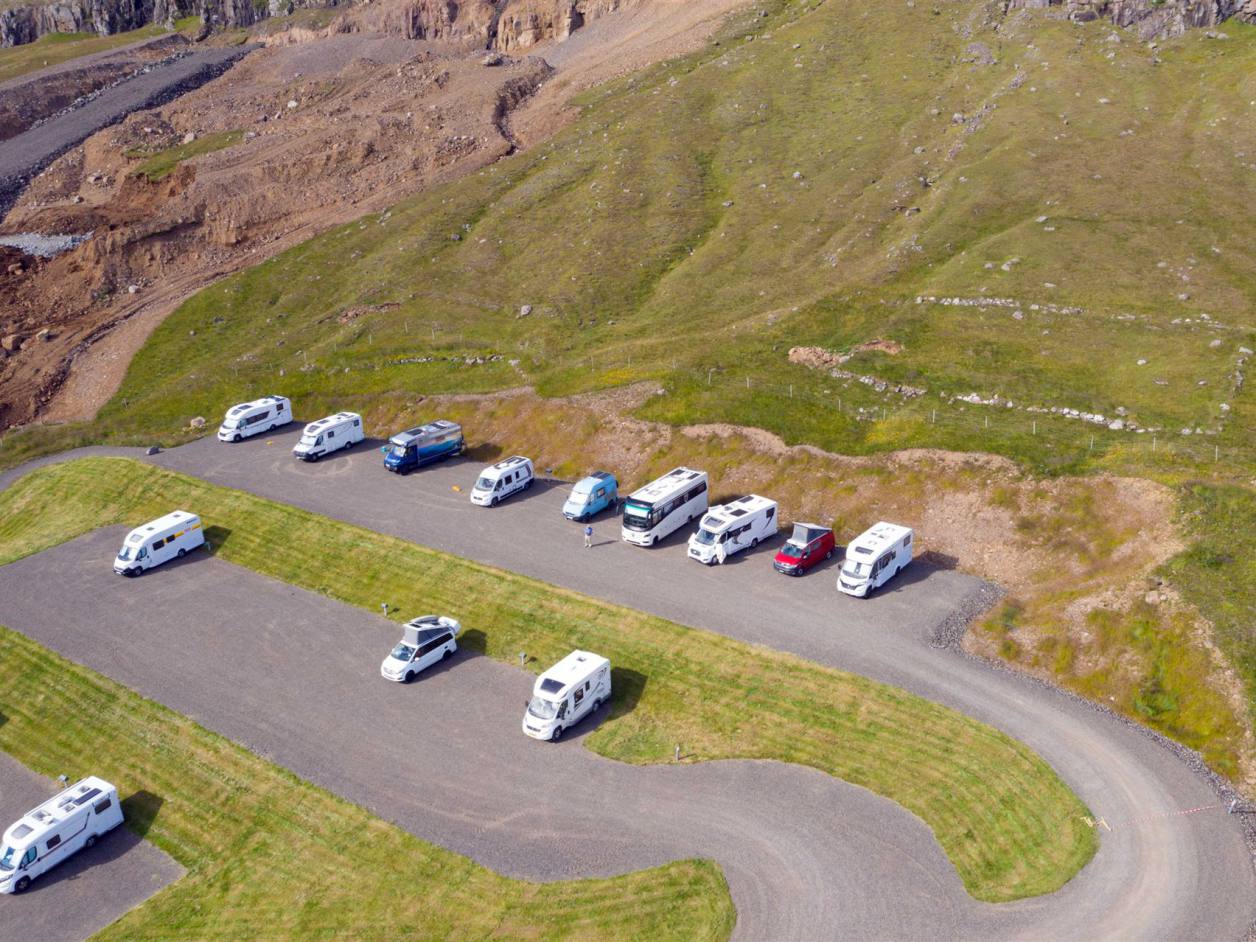 Am späten Nachmittag hatten wir noch das Briefing für den nächsten Tag. Wir gingen noch in das Selbstbedienungs Restaurant um vor der Ankunft noch etwas zu Essen. Pünktlich um 22.30 Uhr lief das Schiff in Torshavn der Hauptstadt der Insel ein. Die. Ladung der Fahrzeuge war etwas unorthodox. Wir standen mit der ganzen Line gegen die Ausfahrt. Also hiess es rückwärts die Schifflänge zurücksetzen. Mit Hilfe des Ladepersonals ging das Prozedere unfallfrei über die Bühne. Wir hatten nur wenige Kilometer zum schmucken Fussball Stadion und der schönen Sportanlage. Auf dem Parkplatz wurden die 15 Fahrzeuge platziert. Es war inzwischen gegen Mitternacht. Schnell wurde es ruhig auf dem Platz.