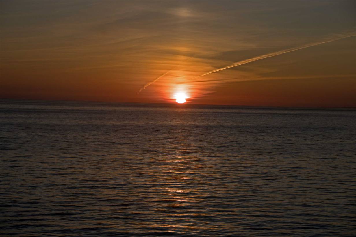 Den Nachmittag verbrachten wir auf dem Aussendeck. Die See ist absolut ruhig. Die Temperatur angenehm warm, auch mit der leichte Brise die auf dem Meer immer wieder herrscht. Um 17.30 Uhr konnten wir die reservierten Plätze m Restaurant einnehmen. Wir genossen das gute und reichhaltige Buffet. Bei interessanten Gesprächen mit dem Reiseleiter und weiteren Teilnehmern wurde es schnell spät. Gegen 23.00 Uhr war dann Sonnenuntergang. Wir harrten lange in der eisigen Luft aus, bis die rote Kugel im Meer versank.