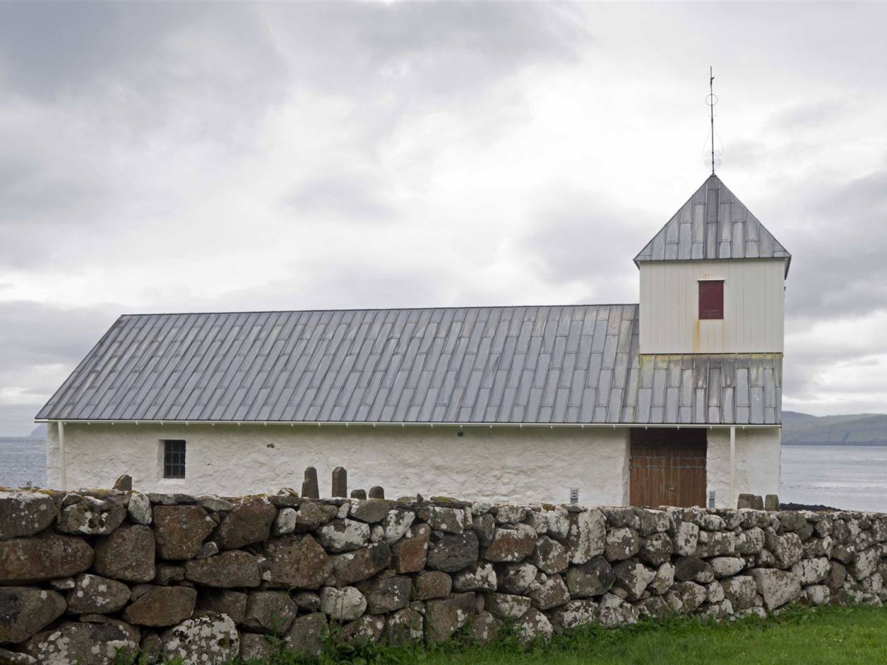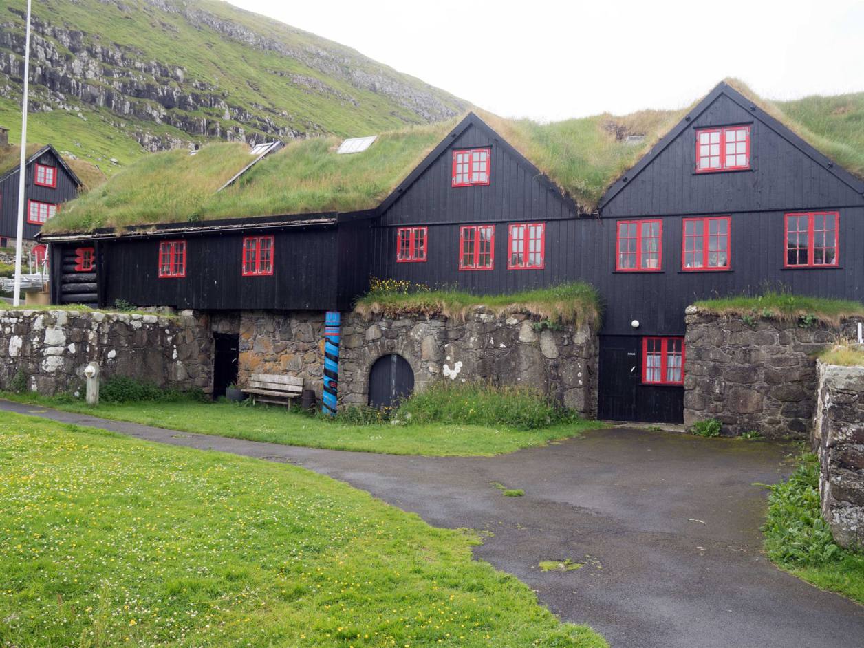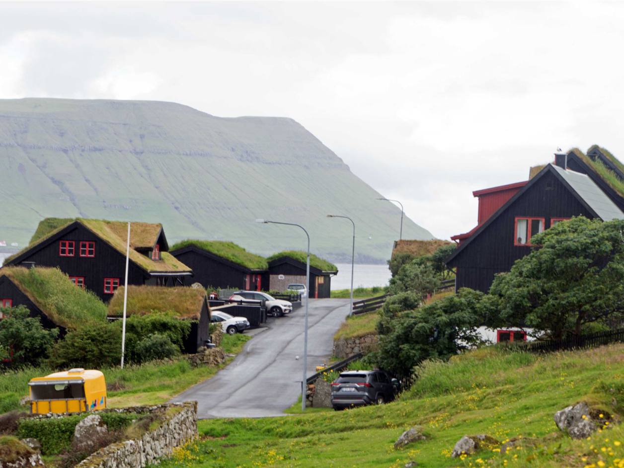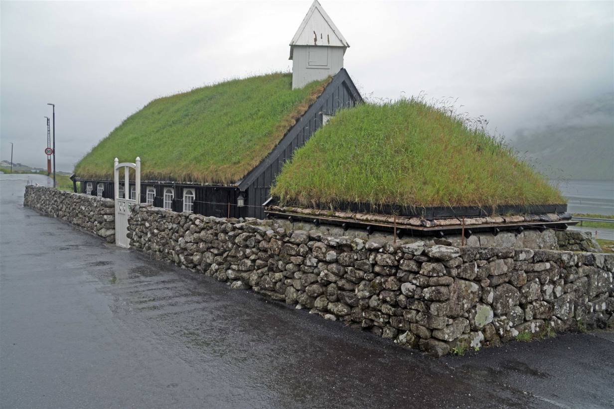 Der Morgen versprach nicht das was einem Freuen konnte. Es war grau und regnete. Unsere erste Fahrt auf den Färöern stand unter keinem guten Stern. Wir fuhren als letzte los. Die Strecke mit 150 km nach Fuglafjördur war nicht lang. Wir konnten zwei Stichstrassen nicht befahren, da die Strassen eng sind und wenig Ausweichmöglichkeiten bestanden. Bei dem schlechten Wetter war das keine Strafe. Die Aussicht war mässig. So hatten wir nur rund 120 km heute zu befahren. Zuerst ging es Richtung Eysturoy, nach weiteren 2 km gibt es an der Hauptstrasse in eine wunderschöne kleine schwarze Holzkirche. Diese war bei unserem Besuch geschlossen. Von Aussen ist sie aber sehr schön mit dem Grass Dach.