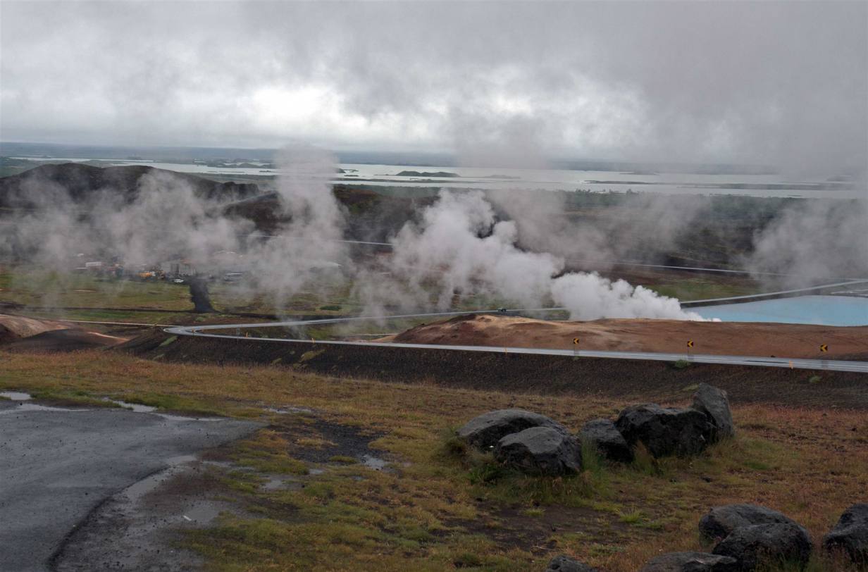Nach dem Besuch fuhren wir weiter auf der Ringstrasse. Die Strasse führt mit einer 10% Steigung bergauf. Von oben hat man eine herrliche Aussicht auf den Myvatn See, die Dampfschwaden des Geo Thermal Gebietes und des Thermalbad. Hier verläuft auch die Bruchkante zwischen der Amerikanischen und der Eurasischen Kontinentalplatte. Der Riss geht quer durch Island.