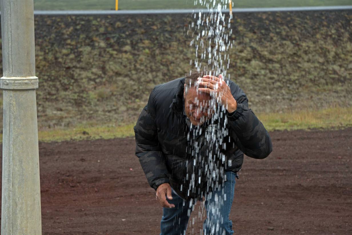 Es hatte in der Nacht weder geregnet noch gewindet. Aber am Morgen hatte es plötzlich Nebel. Glücklicherweise löste sich dieser aber im Laufe des Tages auf und es wurde der erst schöne Island. Heute machten wir nochmals diverse Ausflüge auf eigene Faust. Zuerst ein kurzer Halt unterwegs zum Thermokraftwerk. Mitten im Nirgendwo gibt es eine Dusche mit warmen Wasser. Hans nützte die Gelegenheit die Haare zu waschen.