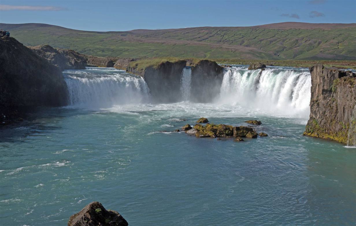 Zuerst besuchten wir einen Wasserfall. Wir waren nicht alleine. Schon von weitem sahen wir die Touribusse. Es hat einen grossen Parkplatz. Von dort aus konnte man entweder links oder rechts des Flusses hochmarschieren. Wir wählten die rechte Seite und waren damit richtig. Die Aussicht auf den Wasserfall (Godafoss) ist beeindruckend.