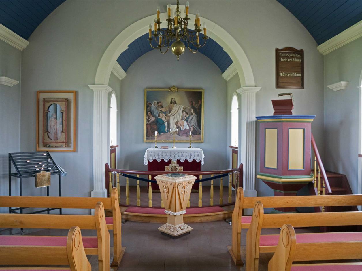 Neben den Wohngebäuden steht noch eine kleine schöne Kirche. Die Kirche Laufáskirkja wurde 1865 von dem aus Laufás stammenden Schreiner und Zimmermann Tryggvi Gunnarsson (1835–1917) und Zimmermann Jóhann Bessason (1839–1912) erbaut und hat eine Kanzel mit der Jahreszahl 1698, und am östlichen Giebel der Kirche erhebt sich eine der höchsten Ebereschen Islands von 1855.[Die Kirche hat eine Grundfläche von 62 m² und verfügt über 110 Sitzplätze.[Sie hat eine Länge von 10,19 m und eine Breite von 6,15 m, und seit 1990 steht sie unter Denkmalschutz.