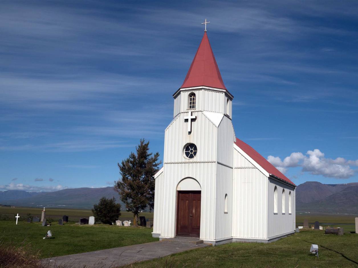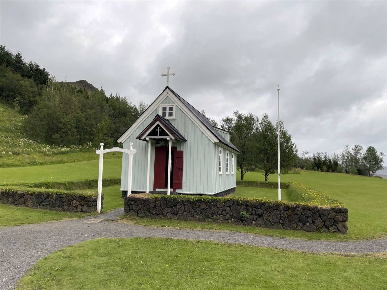 Das war ein kurzer Besuch. Unterwegs machten wir noch einen kleinen Abstecher. Uns wurde ein Dom versprochen. Am Ort stand aber eine kleine Kirche. Über 700 Jahre lang war Hólar das religiöse und kulturelle Zentrum von Nordisland. Nachdem Hólar im Jahr 1106 neben Skálholt zum zweiten Bischofsitz Islands wurde, gelangte das Bistum in den folgenden Jahrhunderten zu beachtlichem Reichtum und konnte schließlich ein Viertel des Landes zu seinem Grundbesitz zählen. Die Kirche aus dem Jahr 1763 ist die fünfte an diesem Platz und gleichzeitig die kleinste. Die Kirche wurde mit einem Glockenturm geplant aber dieser wurde nie gebaut. Der Turm der Kirche stammt aus dem Jahr 1950 und wurde zum Gedenken an den letzten katholischen Bischof von Hólar gebaut.