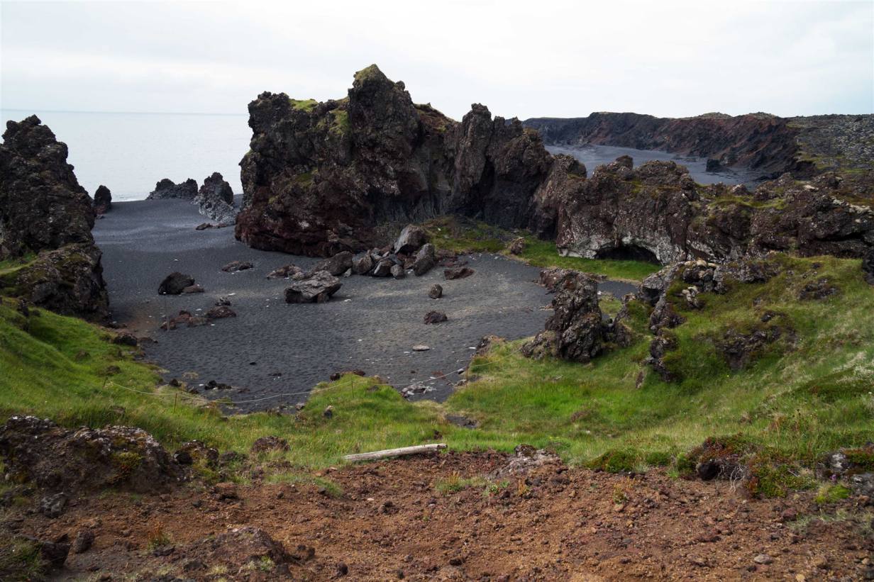 Das Programm war noch nicht fertig. Nur wenige Kilometer später fuhren wir an einen besonderen Ort. Am Fuße des mächtigen Snæfellsjökull liegt der Strandabschnitt Djúpalónssandur. Der dunkle Strand ist durch einen Vulkanausbruch entstanden, dessen Lava bis fast zum Meer floss. Allein der Weg zum Strand ist märchenhaft. Skurril geformte Fels- und Lavagesteine säumen den Weg. Moose, bunte Flechten, Tang, Algen und Muscheln aber vor allem seine kleinen glattgeschliffenen schwarzen Kiesel machen diesen Strand zu einem besonderen Erlebnis. Man nennt diese Kiesel auch „Perlen von Djúpalón“. Im Jahre 1948 strandete ein großer Trawler an der Küste. Noch heute sind hier rostige Teile des Wracks zu finden. Diese sollten aber auf keinen Fall mitgenommen werden, da sie unter Schutz stehen.