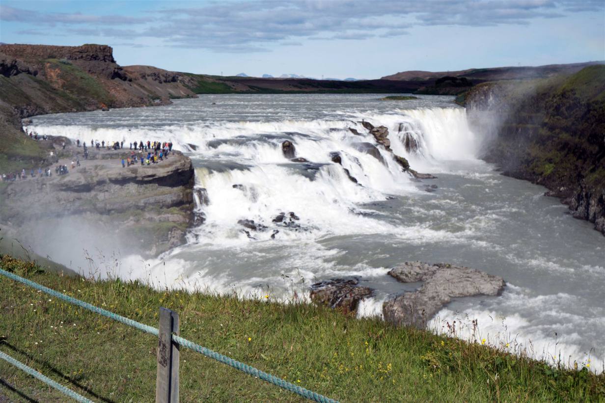 Bei schönstem und vor allem warmen Wetter zogen wir weiter. Wir hatten heute keine grosse Fahrt vor uns. So nahmen wir es gemütlich. Wir fuhren zuerst auf de Campingplatz und bezogen unseren Stellplatz. Gegen Abend fuhren wir dann zu einem Highlight der Reise. Nein nicht der Geysir der neben uns blubberte, sondern 9 km mit dem Fahrzeug zum Gullfoss. Ja das ist schon wieder ein Wasserfall. Der Name goldener Wasserfall macht ihm alle Ehre. Wen man ihn zum ersten mal sieht kann man nur Staunen. Dies ist der schönste Wasserfall von Island. Wir fuhren auf den ersten Parkplatz, der eigentlich nur für die Tourbusse ist, hat aber viel Platz für mein Wohnmobil. So waren wir sofort beim Fall.