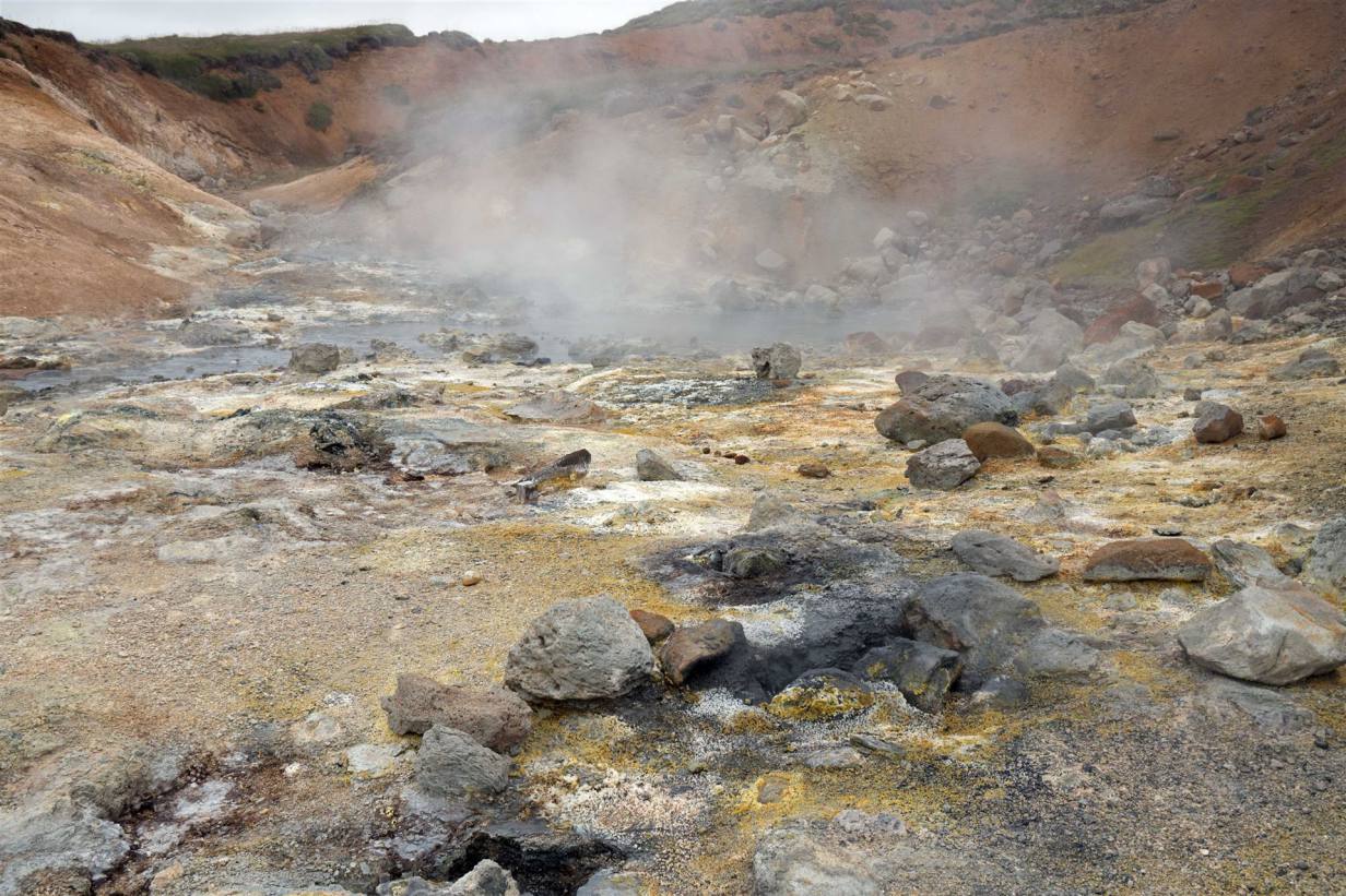 Das Wetter war heute den ganzen Tag bedeckt (Hochnebel). Wir fuhren um halb zehn los. Wir hatten keine grosse Strecke zu bewältigen und auch nicht viel zu besuchen. Unser erster Halt galt dem Thermalgebiet von Seltun. Das Geothermalgebiet mit seinen großen, blubbernden Schlammtöpfen und den farbigen Ablagerungen auf der rotbraunen Erde ist eine Augenweide. Für den Holzstegweg wird man je nach Interesse an den Informationstafeln und Fotopausen zwischen 20 und 30 Minuten benötigen. Will man allerdings den spektakulären Ausblick genießen, sollte man ca. 40 Minuten mehr, gute Schuhe und ein wenig Kondition mitbringen. Am oberen Ende des befestigten Weges führt links ein schmaler Pfad den Hügel hinauf. Meistens sieht man ein paar Leute laufen und bekommt eine Ahnung davon, wie man sich sicher durch das Thermalgebiet Richtung Aussicht zu bewegen hat. Oben angekommen, kann man sich an der Landschaft gar nicht sattsehen. Hinter dem Geothermalgebiet liegt einer der tiefsten Seen Islands, der Kleifarvatn. Bekannt wurde er 2000, als er nach einem starken Erdbeben ein Fünftel seiner Wassermenge 'verlor'. Wir beliessen es unten zu bleiben. Auch hier blubbert es aus allen Löchern. Der Schwefelgestank zeigt uns dass da unten in der Erde etwas los ist.