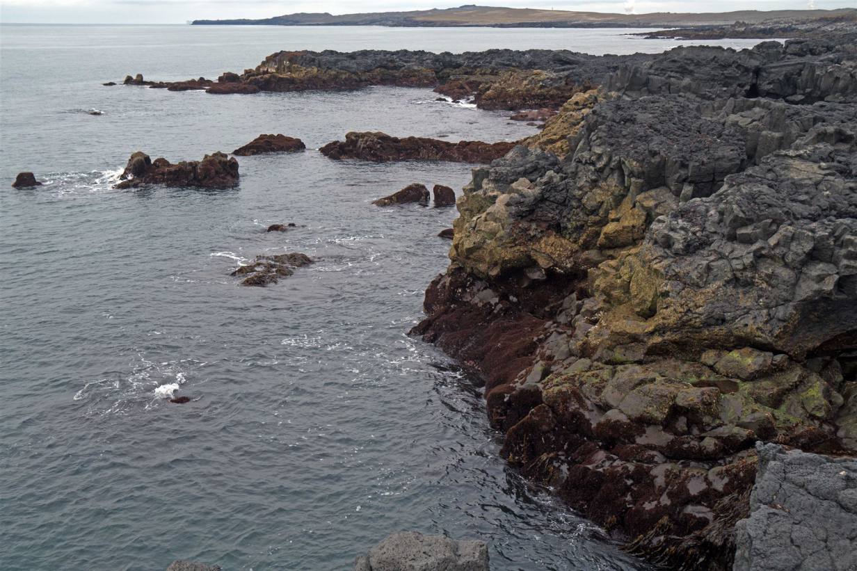 Beim Starten war es noch stark bewölkt, aber trocken. Wir fahren heute in die Hauptstadt Reykjavik. Unterwegs gibt es wenig zu besichtigen. Uns erster Stopp war Brimketill. Vom Parkplatz aus sind es wenige Meter bis zum Brandungskrater. Der Naturpool Brimketill auf der Halbinsel Reykjanes ist von ganz anderer Art und ein Bad lässt dort schon gar nicht geniessen. Trotzdem ist Brimketill auf jeden Fall einen Besuch wert. Wie man diesen antrifft ist allerdings wetter- und gezeitenabhängig von Gezeiten. Brimketill heisst übersetzt Brandungskessel und ist ein geologisches Wunderwerk der Natur. Die ständige Brandung hat die grandiose Form eines Pools am Küstenfelsen aus Lava geschaffen. Es erklärt sich von selbst, dass dieser Pool nicht mit dem warmen geothermischen Wasser nicht gefüllt ist wie die vielen Hot Pots und Schwimmbäder in Island. Es sind die Wellen und Brandung des kalten Nordatlantiks, welche Brimketill speisen. Leider war das Meer ohne Brandung, sodass man nur die "Badewanne" sah.