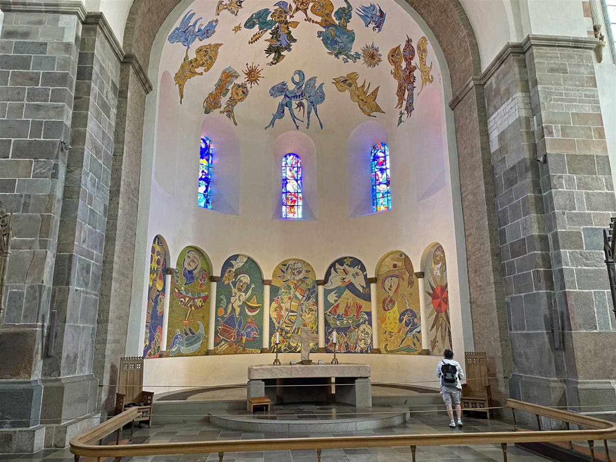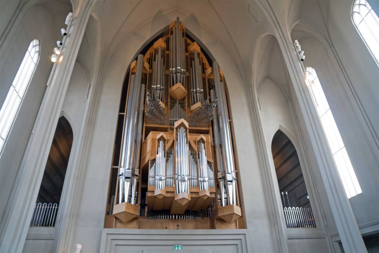 Nun kam das nächste Highlight eine grosse Steinkirche. Die Hallgrimskirche krönt mit ihrem 73m hohen Turm, der über alle anderen Gebäude Reykjavíks hinausragt, Islands Hauptstadt auf eindrucksvolle Weise. Kein anderes Bauwerk des Landes hat eine ähnlich lange Zeit zur seiner Errichtung in Anspruch genommen und nur wenige lösten so viele Kontroversen aus wie die Kirche. Heute ist sie mit Sitzplätzen für 1200 Besucher das größte Gotteshaus der Insel. Das Innenleben der Kirche ist nicht besonders, ausser dass sie mit hohen Säulen gebaut wurde. Was aber erwähnenswert ist ist die grosse Orgel. Im Dezember 1992 wurde die große Konzertorgel der Kirche eingeweiht, erbaut von Johannes Klais Orgelbau in Bonn. Sie verfügt über einen mechanischen Spieltisch mit 4 Manualen und Pedalwerk, 72 Register und 5275 Pfeifen. Die Orgel ist ca. 15m hoch und wiegt 25 Tonnen. Sie ist mit Abstand das größte Instrument ihrer Art in Island und wird neben ihrer Aufgabe beim Gottesdienst auch für Konzerte eingesetzt. Ein zweiter Spieltisch im Kirchenschiff wurde 1997 eingebaut. Der Orgelkauf wurde u.a. durch Pfeifenstiftungen finanziert. Unter den sichtbaren Orgelpfeifen des Prospekts, der Front, dominieren die seitlichen Pfeifen mit ca. 10m Länge.
