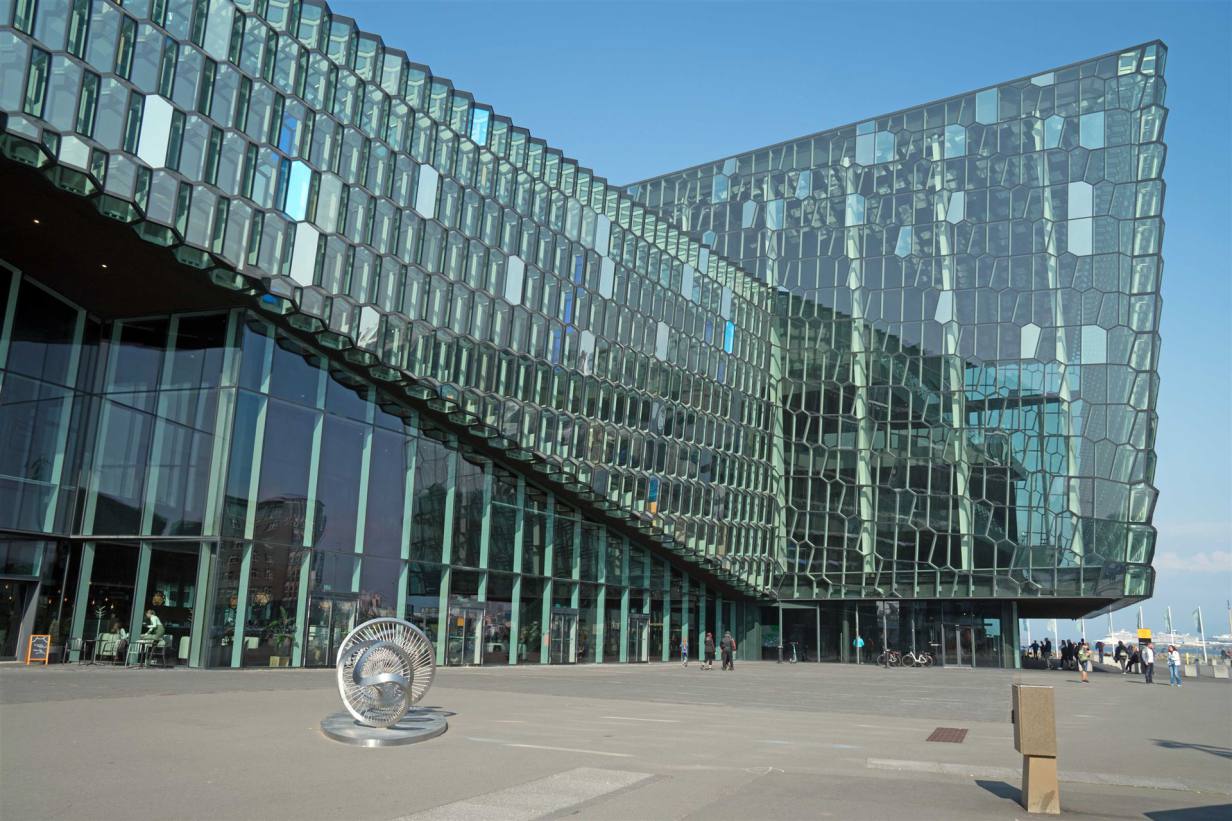 Den letzten Halt machten wir am Hafen. Dort steht direkt am Meer das eindrückliche Konzert- und Konferenzhaus Harpa. Geplant wurde es vom dänischen Architekturbüro Henning Larsen in Zusammenarbeit mit dem isländischen Büro Batteriid Architects. Bei ihrem Entwurf ließen sie sich vor allem durch die isländische Natur inspirieren: Während die Gebäudekubatur an die schroff abfallende Felsenküste erinnern soll, ist die farbliche Gestaltung der Fassade den schwarz glänzenden Basaltformationen der isländischen Vulkanlandschaft nachempfunden. Das Gebäude besteht aus zwei großen quaderförmigen Volumen mit schrägen Kanten, die leicht versetzt zueinander angeordnet sind. Der Neubau ist 43 m hoch und umfasst 28.000 m². Er beherbergt eine Konzerthalle für 1.800 Besucher, drei große und mehrere kleinere Konferenzräume sowie eine Bar und ein Restaurant.
