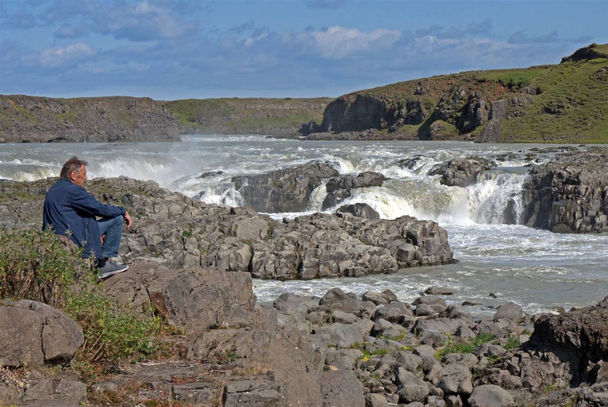 Als ich etwas später runterlief war Hans bereits am Meditieren. Der Urriðafoss ist der wasserreichste Wasserfall Islands und damit sollte man denken, dass er von jedem Touristen besucht wird. Vor allem auch, weil er wirklich nah an der Ringstraße liegt. Es dauert es nur wenige Minuten, um ihn zu erreichen. Dennoch wird er wohl auf der Fahrt Richtung Osten häufig übersehen. Der breite Wasserfall mit bis zu sechs Metern Fallhöhe wird durch mächtige Felsen in der Mitte geteilt. Die großen Wassermengen von bis zu 360 Kubikmetern pro Sekunde verdankt er dem Fluss Þjórsá, dem mit 230 Kilometern Länge längsten Fluss Islands. Er wird von zwei Gletschern gespeist.