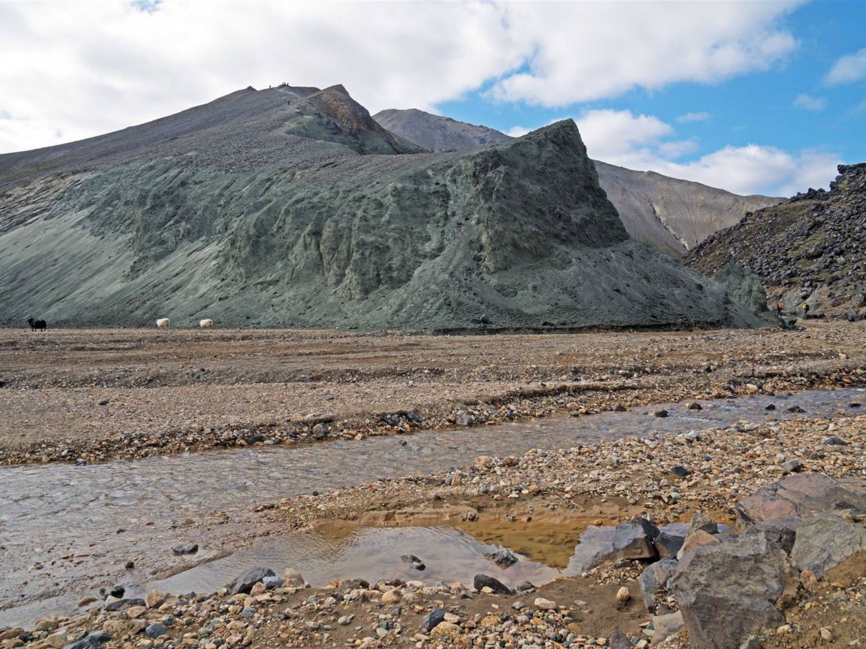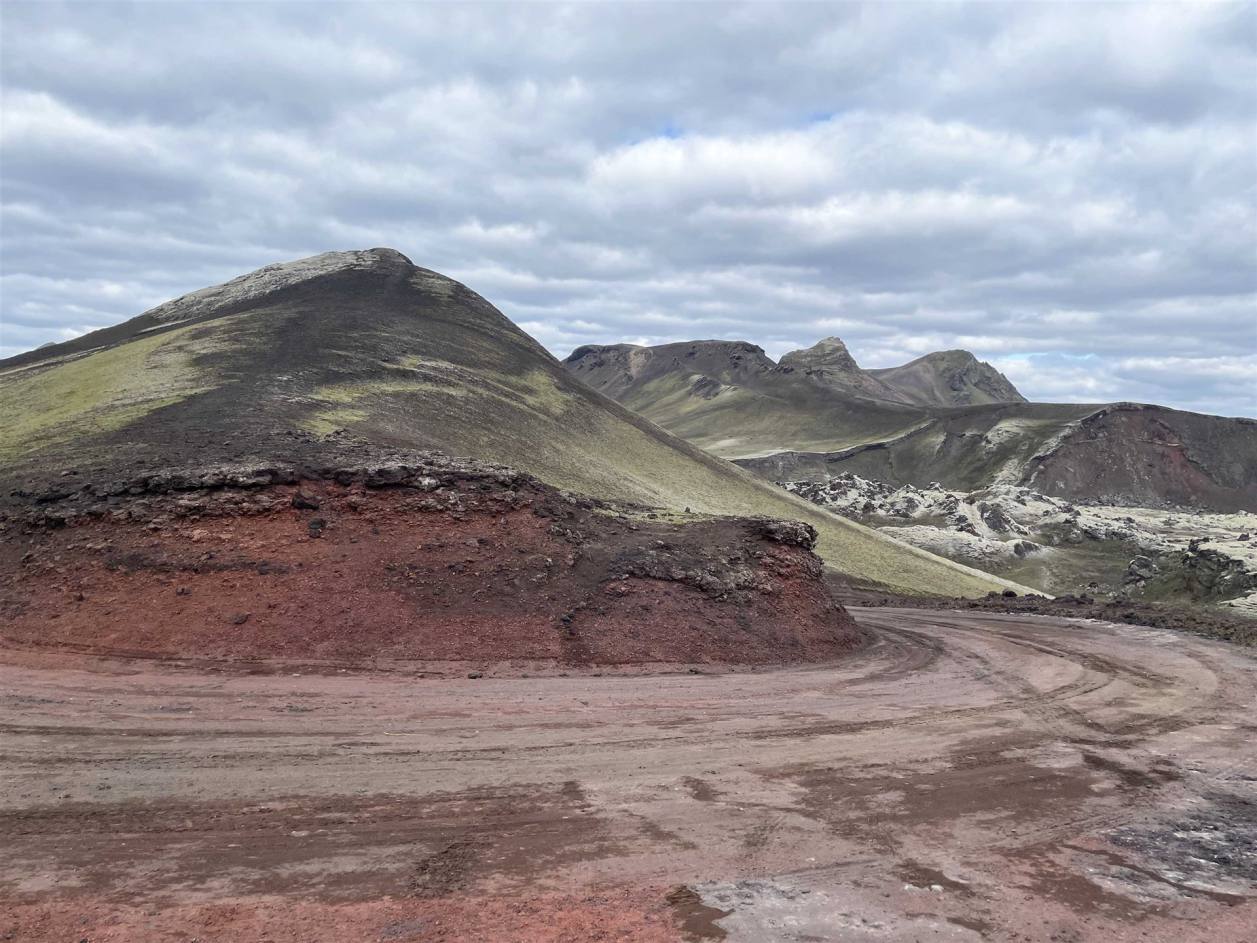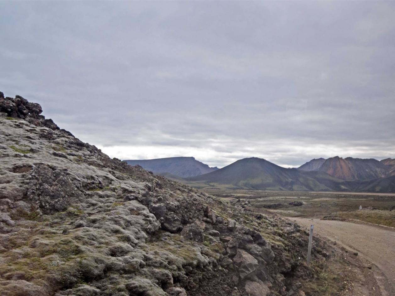 Die beiden beeindruckendsten Berge, Brennisteinsalda, die "Schwefel-Welle" und Bláhnúkur, der "Blaue Gipfel" befinden sich sehr nah beieinander. Brennisteinsalda ist hauptsächlich gelb, mit Flicken aus Rot, Rosa und etwas Blau, während Bláhnúkur von einem dunklen Graublau mit grünen Flicken ist. Die zusätzlichen Fetzen weißen Schnees fügen der Szenerie noch weitere Kontraste hinzu. Gestein. Der Himmel war bedeckt, sodass die Farben nicht so zu sehen sind.