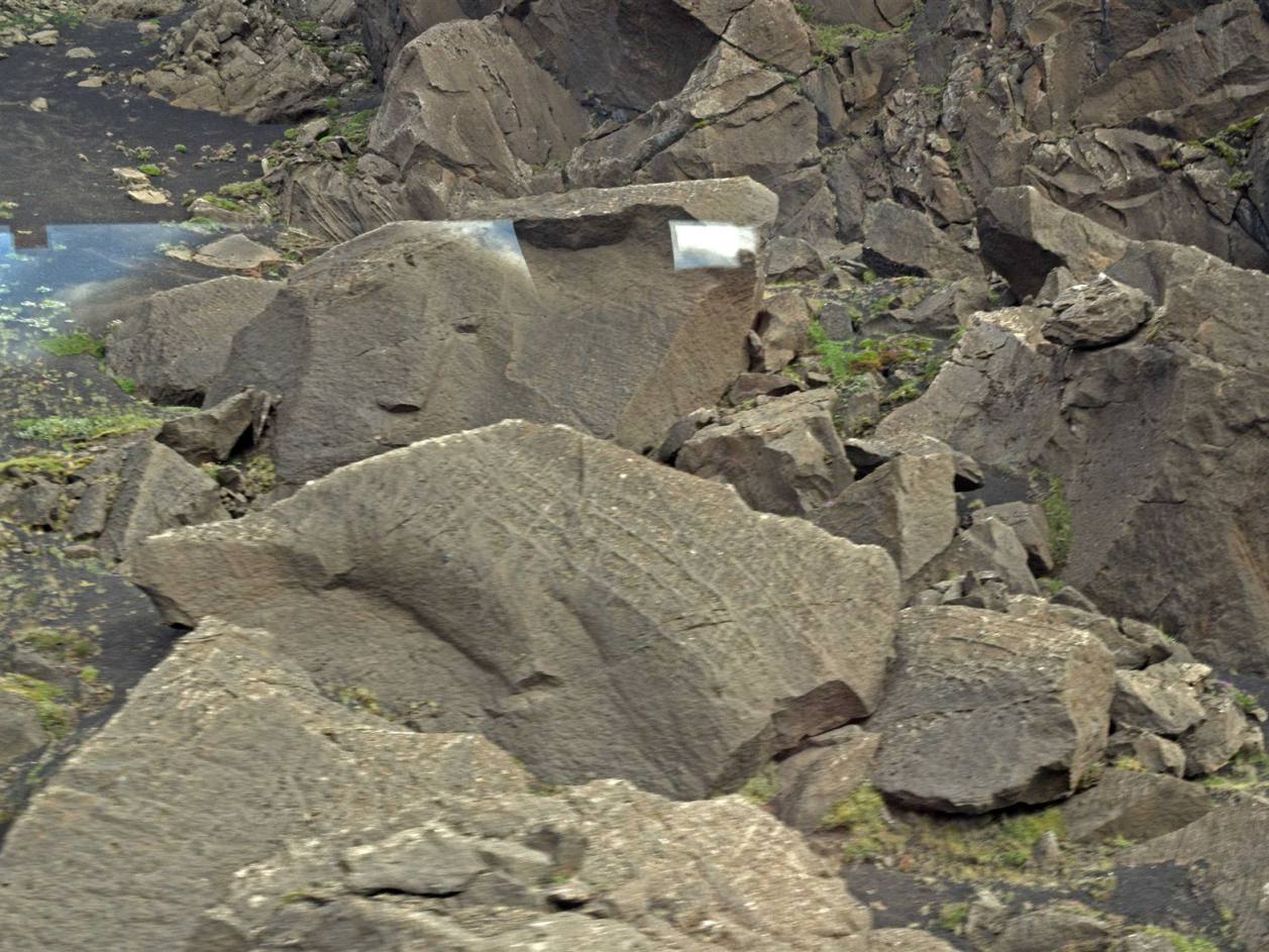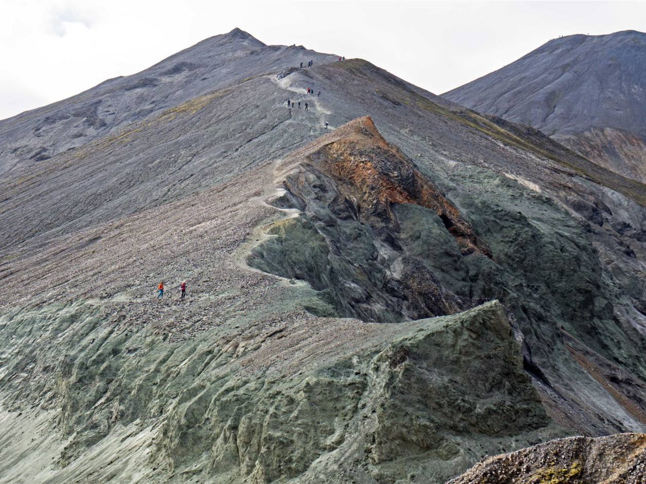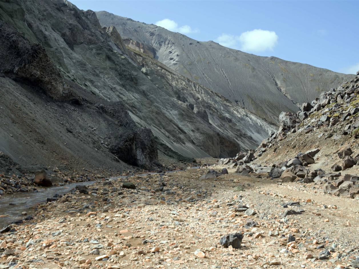 Die beiden beeindruckendsten Berge, Brennisteinsalda, die "Schwefel-Welle" und Bláhnúkur, der "Blaue Gipfel" befinden sich sehr nah beieinander. Brennisteinsalda ist hauptsächlich gelb, mit Flicken aus Rot, Rosa und etwas Blau, während Bláhnúkur von einem dunklen Graublau mit grünen Flicken ist. Die zusätzlichen Fetzen weißen Schnees fügen der Szenerie noch weitere Kontraste hinzu. Gestein. Der Himmel war bedeckt, sodass die Farben nicht so zu sehen sind.