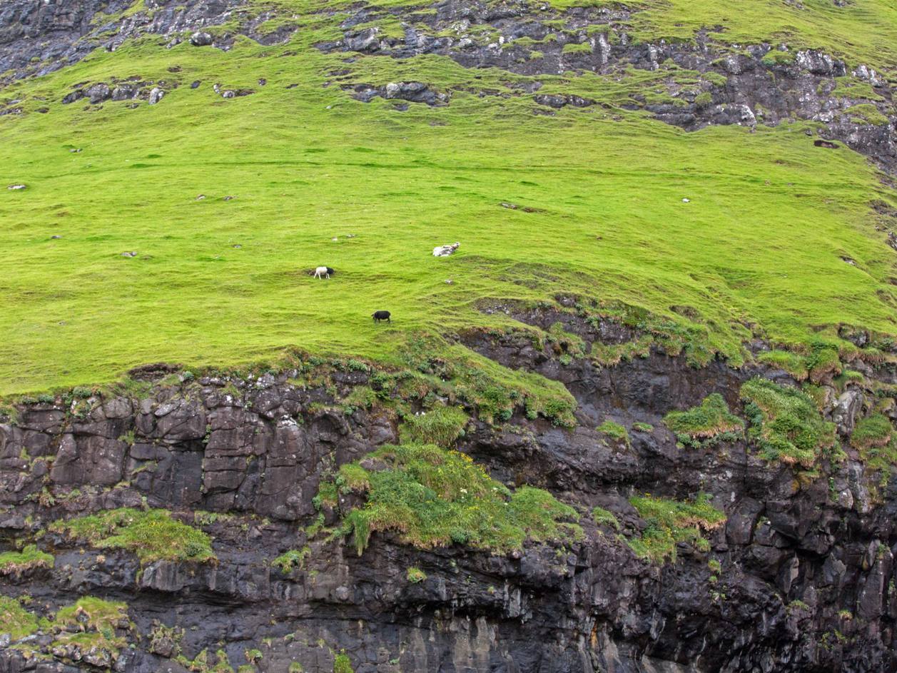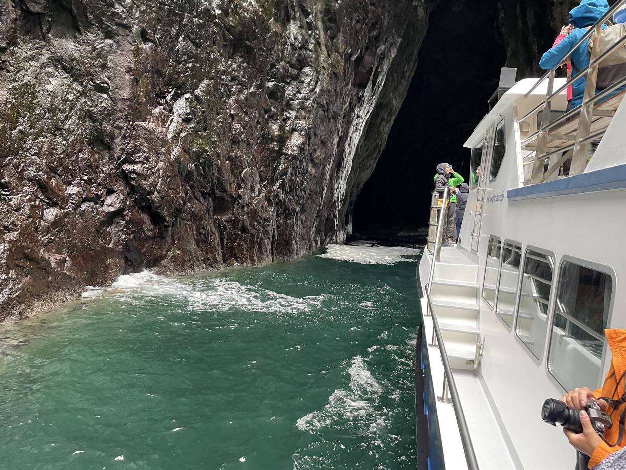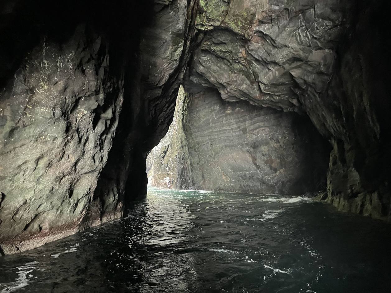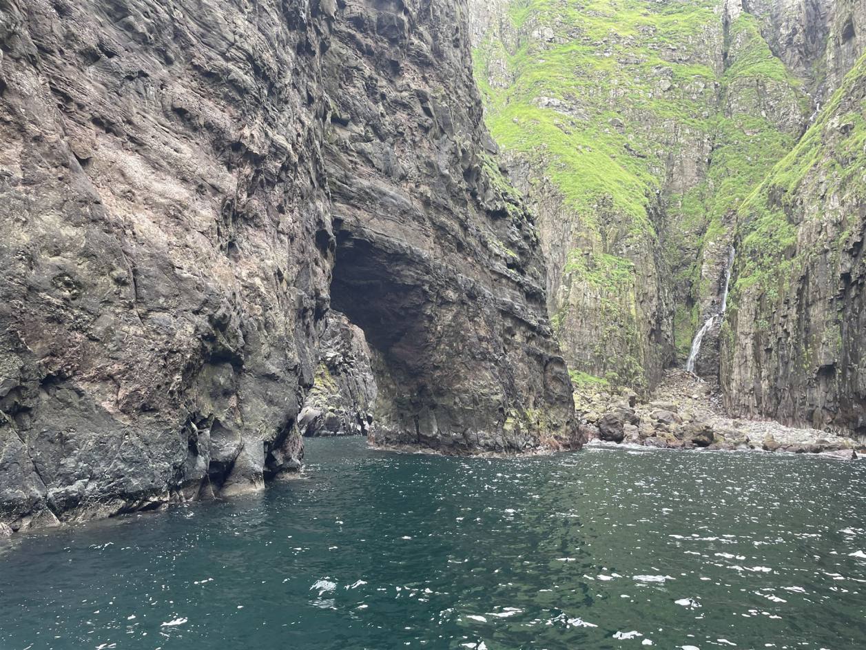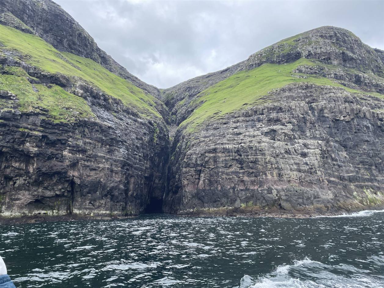 Wir waren rund 5 km von einem Ort entfernt. So fuhren wir zurück und fragten an der Tankstelle nach einem Mechaniker. Er konnte uns selbst nicht Helfen gab uns aber einen Tip. So fuhren wir 4 km weiter wo es einen Pneuhändler gab. Dieser wechselte uns das Reserverad auf das defekte Rad. Nach etwas mehr als einer Stunde konnten wir weiter fahren. Die Suche nach einer Werkstatt die uns die Spur einstellen konnte war auf den Färöern erfolglos. Morgen fahren wir mit dem Schiff auf Island. Wir werden es dort dann probieren. So fuhren wir dann anschliessend direkt zu unserem Campingplatz direkt am Meer. Nach dem Schrecken kam dann aber das Tages Highlight. Wir machten eine Schiffahrt die es in sich hatte. Das werden wir niemals vergessen. Wir fuhren den Klippen entlang auf das Meer. Le länger es dauerte desto mehr bekamen wir die Natur zu spüren. Es schaukelte recht massiv. Das Boot hatte aber einen excellenten Kapitän der nun seine ganzen Qualitäten ausspielte. Er fuhr nun an diversen Stellen in die Klippen rein, Millimeter genau bei recht starkem Wellengang. Links und Rechts waren teilweise noch gut 50 cm Spielraum. Die Atmosphäre in den Felsen einfach grandios.