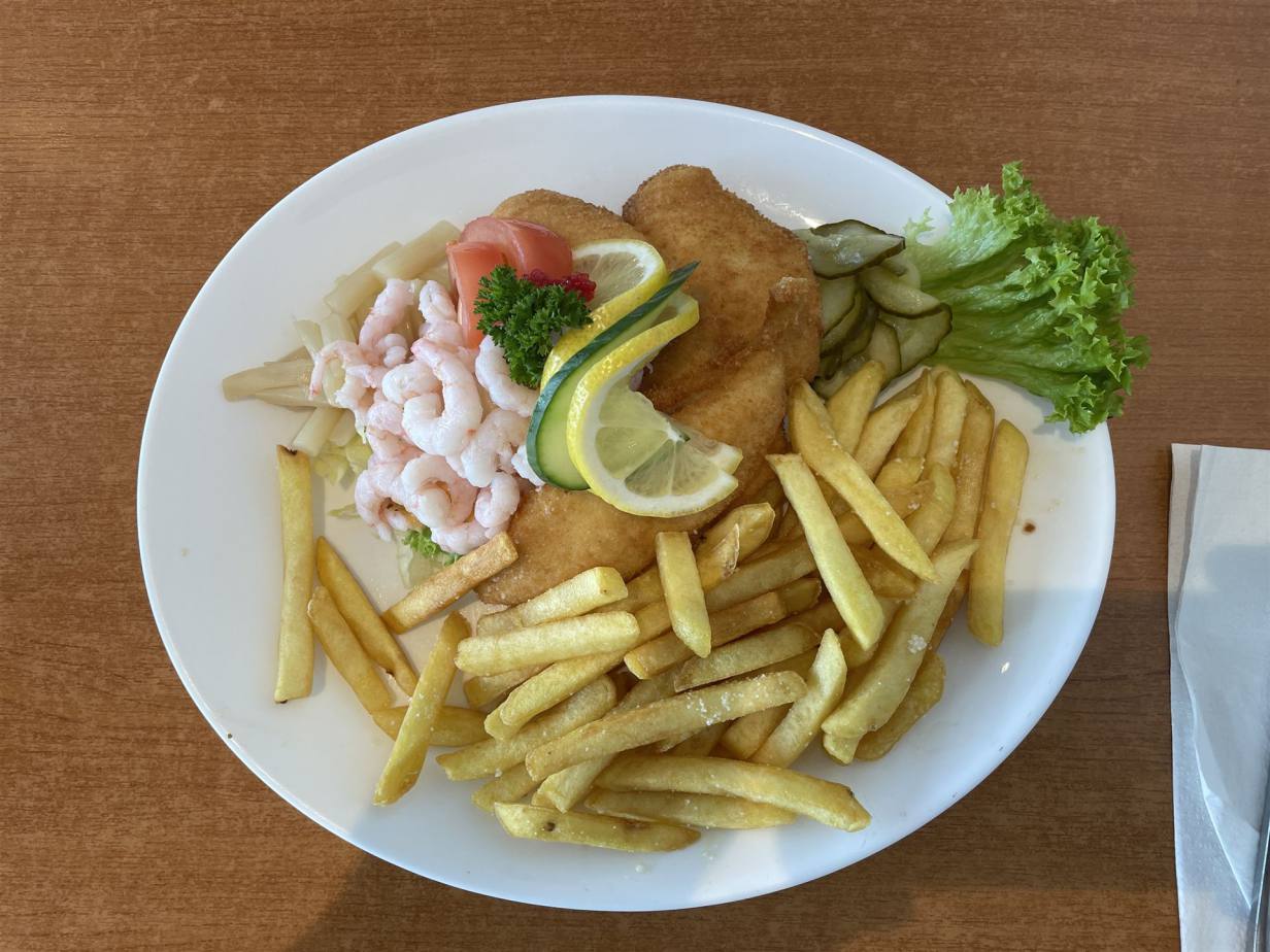 Wir benutzten die Zeit mit Lesen. Gegen Mittag wurde es immer Heller und die Sonne schien zwischen den Wolken durch. Ich hatte eine Idee, die wir sofort umsetzten. Mit dem Wohnmobil fuhren wir zum Hafen. Dort haben wir ein Fischrestaurant gesehen. Leider war es gestern schon geschlossen. Wir bestellten Fisch und wurden nicht enttäuscht. Die Idee mit dem Fahrzeug zu fahren war eine geniale. Während wir genüsslich speisten kam Regen auf und starker Wind. Wir kauften noch einige Lebensmittel und neben dem Einkaufsgeschäft fand ich noch feste neue Schuhe. Nun hatte ich eigentlich alles erledigt, was ich noch vor der Ueberfahrt vor hatte. Wir fuhren anschliessend wieder zum Stellplatz und ruhten uns den Rest des Tages aus.