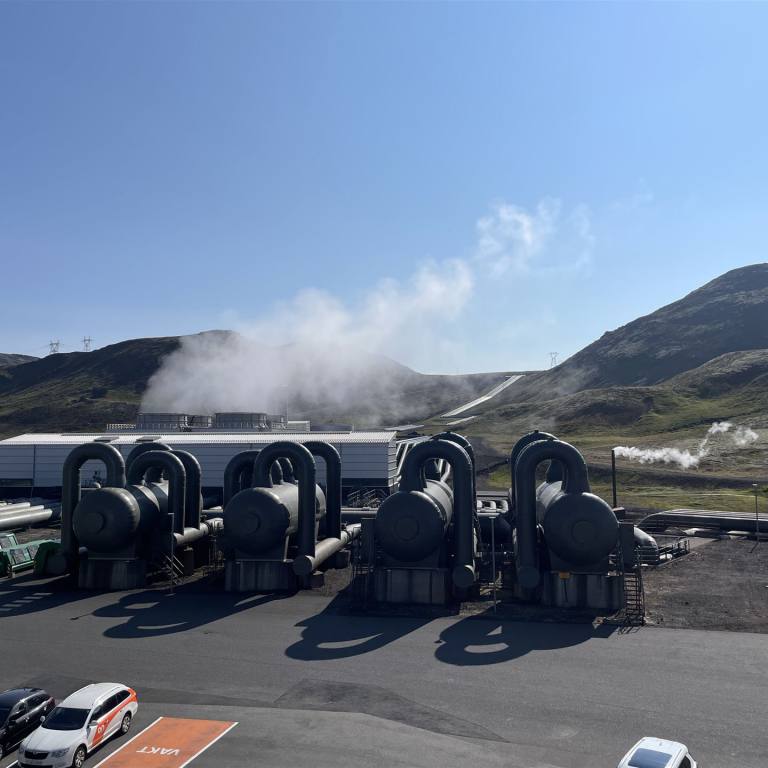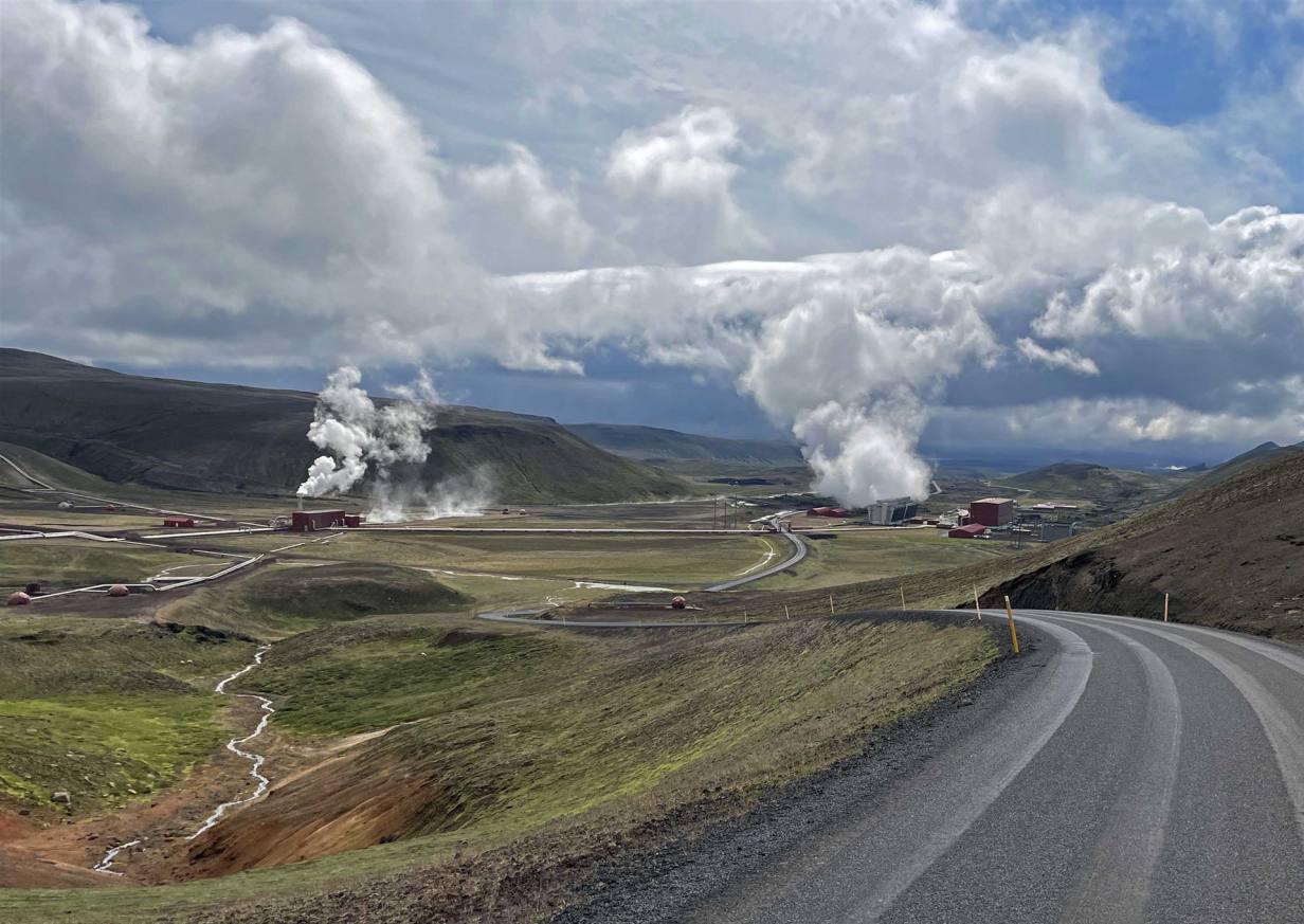 Auch heute Morgen konnten wir uns am schönen Wetter freuen. Wir haben heute keine grosse Strecke, sodass wir es gemütlich angehen liessen. Unsere erste Etappe war nur 30 km weit. Wir besuchten ein Geothermal Kraftwerk. Das Kraftwerk Hellisheiði wurde am Vulkan Hengill etwa 25 km außerhalb der isländischen Hauptstadt Reykjavik errichtet. Es dient hauptsächlich dazu, den steigenden Heißwasserbedarf des Hauptstadtgebietes zu decken, produziert aber auch Strom. Mit einer installierten Leistung von 400 MW (thermisch) bzw. 300 MW (elektrisch) ist es das größte geothermische Kraftwerk der Welt. Rund 50 Bohrlöcher wurden für das Kraftwerk niedergebracht, die meisten zwischen 1.000 Meter und 2.000 Meter tief. Für die Stromerzeugung werden 6 Hochdruckturbinen (jeweils 45 MW) genutzt, weitere 30 MW Strom werden von einer Niederdruckturbine erzeugt. Das Restwasser wird über weitere Bohrungen wieder in eine Tiefe von etwa 400 m zurückgeführt. Das Kraftwerk hat sehr moderne Gebäude und beinhaltet für Touristen eine Ausstellung der Anlage und des Thermal Kraftwerkes.