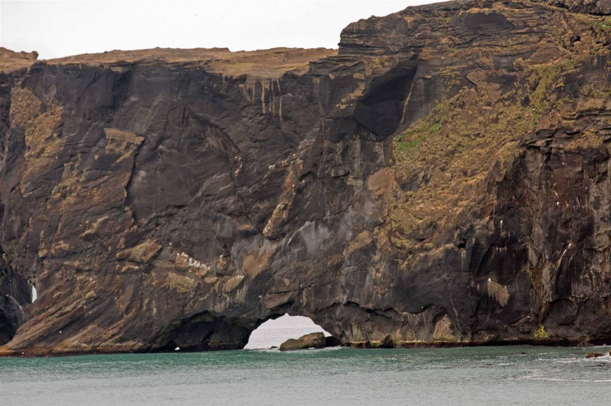 Nach weiteren 25 km folgten wir einer Stichstrasse zum Meer. Kap Dyrhólaey – die „Türhügelinsel“ – liegt westlich von Vik i Myrdal und markiert den südlichsten Punkt Islands. Dyrhólaey ist ein Inselberg, der vor tausenden von Jahren durch submarine vulkanische Aktivität entstanden ist. Dyrhólaey ist heute verlandet und die Insel so zu einem Kap geworden. 120 m ist das Kap selbst hoch. Seinen Namen verdankt es dem Felsen mit seiner markanten Form, die an ein gigantisches Tor mitten im Meer erinnert. Boote können hier problemlos durchfahren.