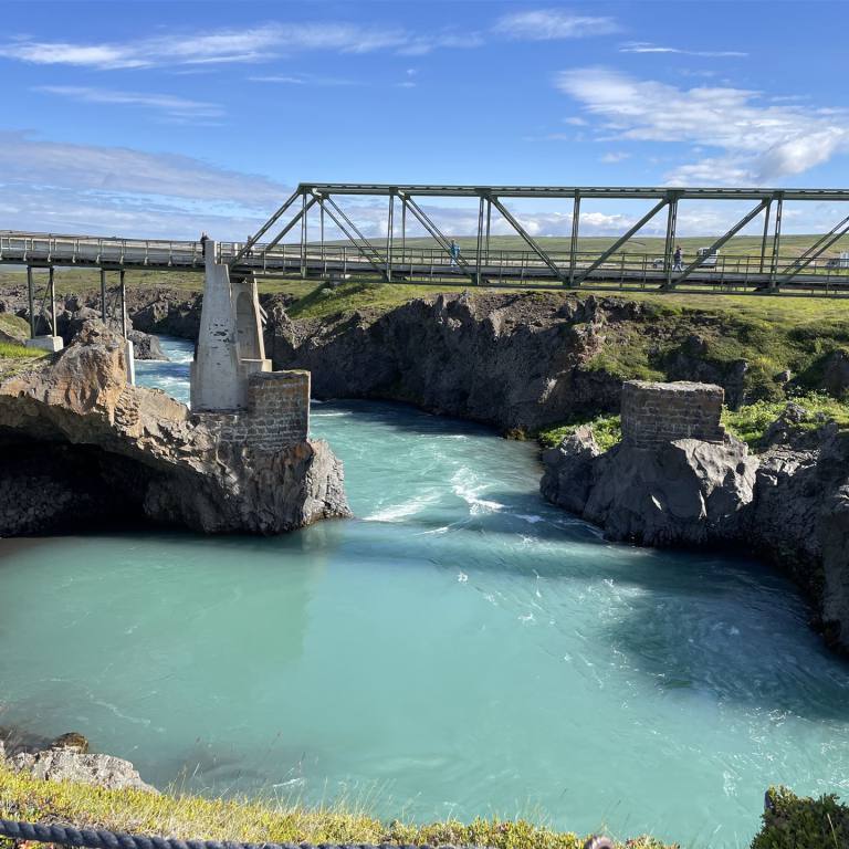 Ein wunderschöner Morgen überraschte uns heute. Es war wolkenlos, sonnig und an der Sonne schon angenehm warm. Wie bereits angekündigt fuhren wir eine kurze Strecke wieder zurück. Als erstes gab es zwei weitere Wasserfälle zu bestaunen. Sie liegen hintereinander. Wieder erwartete uns ein völliger neuer Anblick des Wasserfalles. Dieser kam nicht wie bisher von den Bergen, sondern es war ein Fluss der eine Höhendifferenz überwinden musste. Die Wasserfälle Hraunfossar und Barnafoss fallen das Lavafeld von Hallmundarhraun herunter und münden in den Hvítá-Fluss Sie werden oft als einige der schönsten Wasserfälle Islands gelistet. Das unfassbar blaue Wasser kommt direkt aus dem Langjökull Gletscher, dem zweit größten Gletscher Islands.