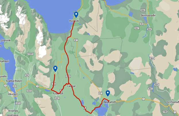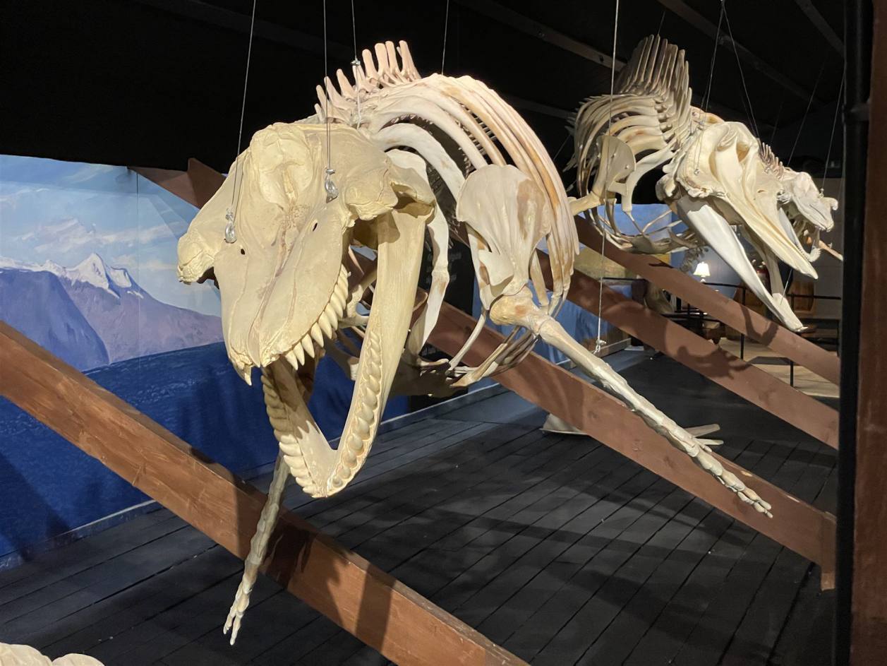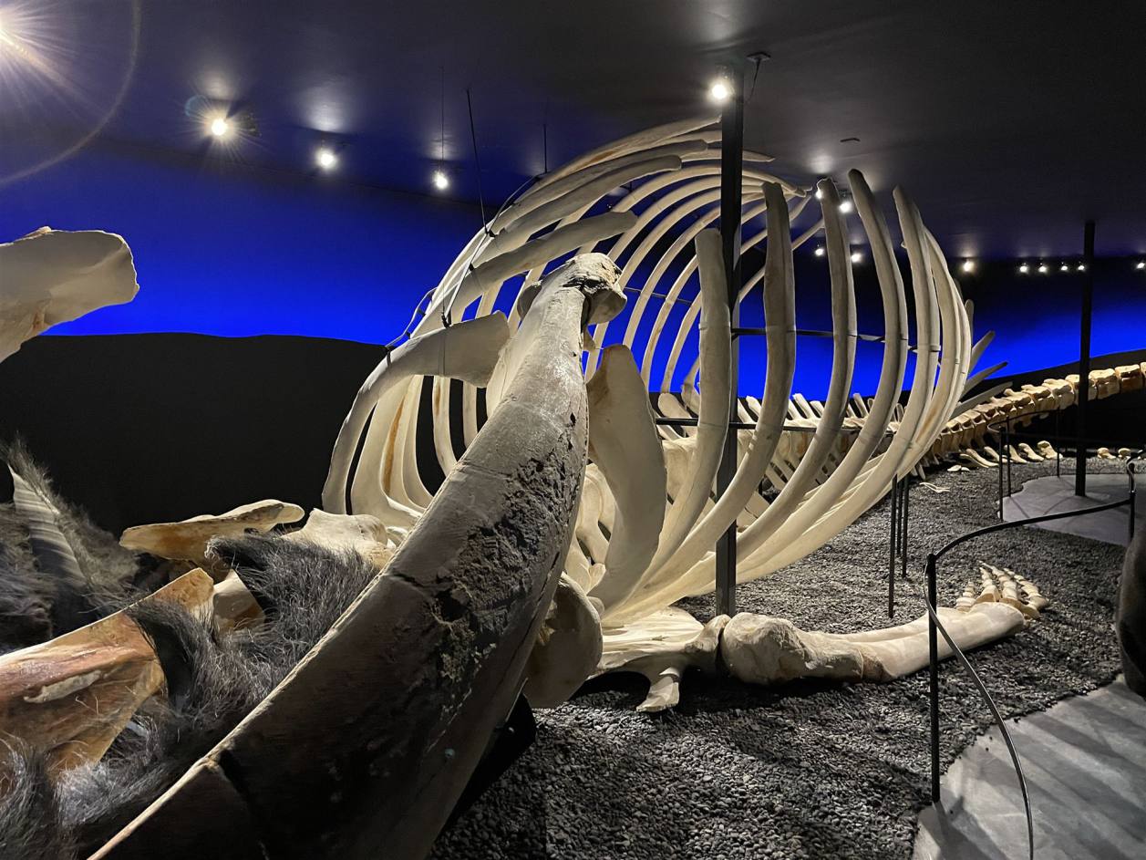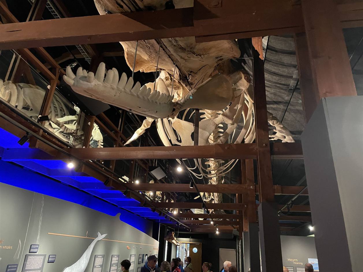 Wir mussten wieder bis zur Ringstrasse zurückfahren, da der direkte Weg für uns gesperrt war. Eine Holzbrücke war für Fahrzeuge über 3.5 t gesperrt. So machten wir ein paar Kilometer mehr als die anderen. In Husavik angekommen parkierten wir vor der Sporthalle wo wir bis Morgen bleiben. Wir hatten noch eine Besichtigung des Wahlmuseums auf dem Programm. Der Führer der uns das Museum eigentlich zeigen sollte kam aber nicht. So konnten wir alleine die Ausstellung besuchen. Das Museum wurde1997 mit dem Ziel gegründet, die Öffentlichkeit über Wale zu informieren. Die Ausstellung konzentriert sich auf die Biologie und Bedrohung der in isländischen Gewässern vorkommenden Wale. Gesonderte Themenräume geben Einblicke in die Geschichte des isländischen Wahlfangs, Wahlbeobachtung, Walstrandungen und Naturgeschichte. Daneben verdeutlichen zahlreiche Skelette die Anatomie und Größe verschiedener Walarten. Es gab auch einen Raum der sich mit dem Wahlfang beschäftigte. Es wurde ein Film über die Blutigen Jagden gezeigt.