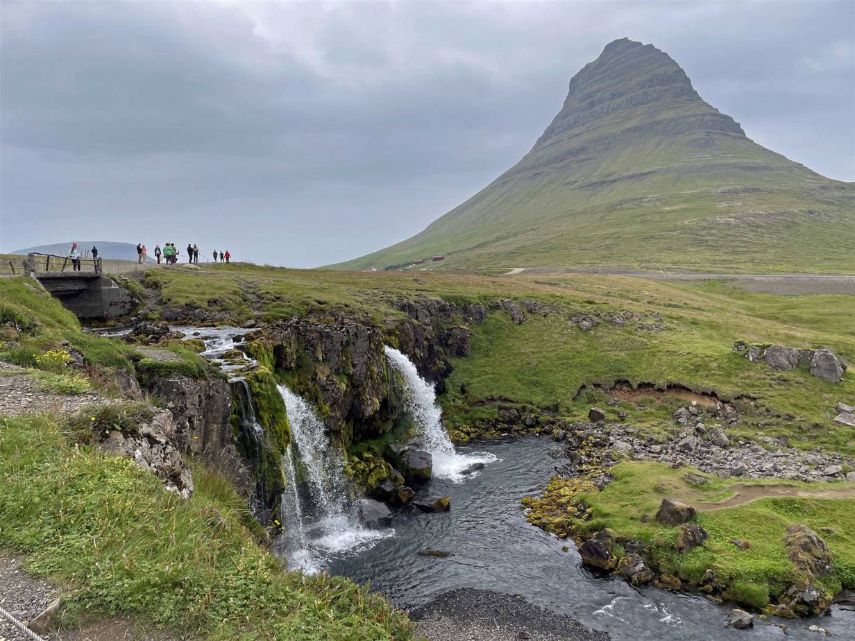 Wenige Kilometer weiter konnten wir einen weiteren Wasserfall besuchen. Kirkjufell ist ein malerischer Berg, der sich hoch über der Stadt Grundarfjörður auf der Halbinsel Snæfellsnes erhebt. Er ist als schönster Berg Islands bekannt und eines der meist fotografiertesten Wahrzeichen. Der Kirkjufell-Berg war eine Filmlocation für die sechste und siebte Staffel der berühmten Serie Game of Thrones, wo er als „Pfeilspitzen-Berg“ bezeichnet wurde, der von den Jagdhunden und der Gruppe Nordwand gesehen wurde als sie einen Wicht fingen. Man sieht dass hier hauptsächlich junge Touristen kommen um ein Selfie zu machen. Sie haben sicher den Film gesehen.