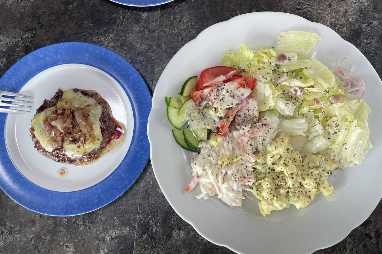 Voller Eindrücke und langsam Müde von den Besichtigungen fuhren wir zu unserem Ziel Anarstapi. Der grosse naturbelassende Campingplatz hat eine Seeschwalben Kolonie, die ihr Revier mit allen Mitteln verteidigt. Mit Sturzflügen bis nahe an den Kopf verteidigen sie ihre Nester, die auf dem Boden sind. Es ist fast schon Volksbelustigung wenn neue Camper ankommen, das Fahrzeug abstellen und beim Aussteigen angegriffen werden. Unsere Gruppe ist nun auf einer 4 km langen Wanderung mit Regenschirm als Verteidigung. Vor der Wanderung hat mein Starkoch noch das Abendessen gemacht. Er hat immer gute Ideen und zaubert etwas gutes auf den Teller. Heute war es ein Hamburger mit Salat.