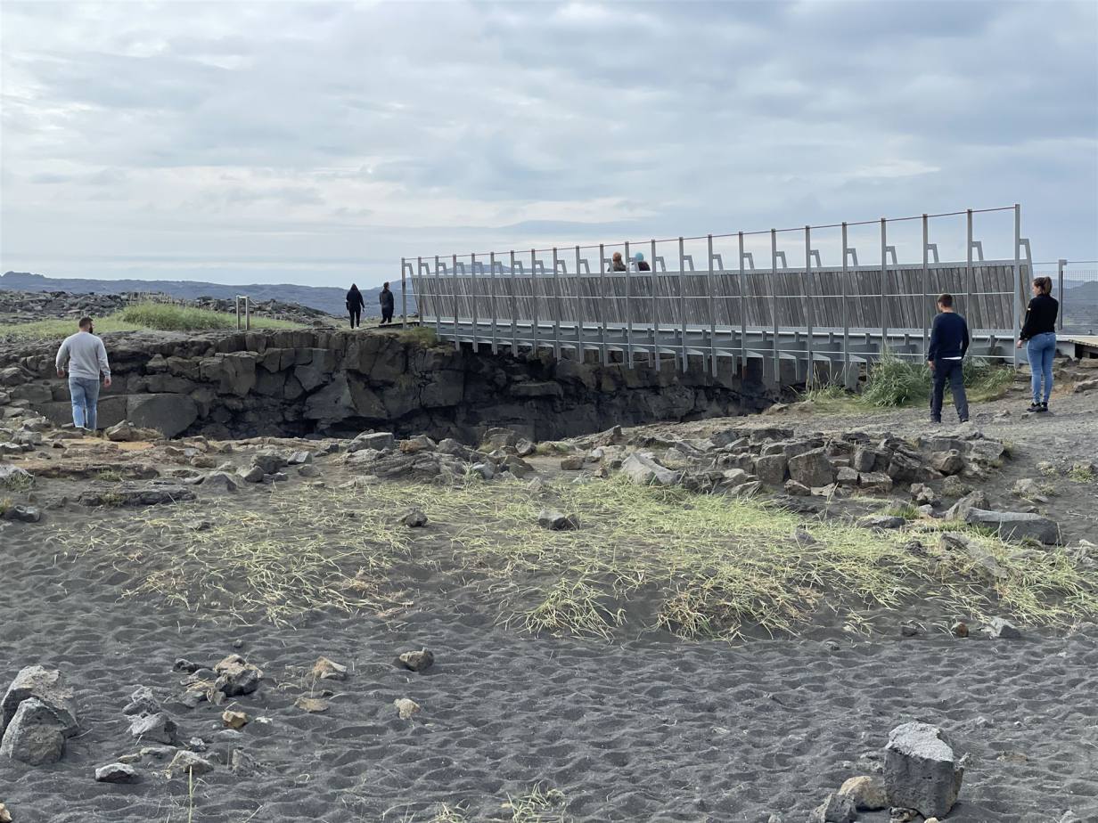 Unser nächster Halt war die Brücke zwischen den Kontinenten. Wo kann man von Amerika nach Europa laufen ? Auf Island ist das möglich, zumindest symbolisch. Denn quer durch die Insel zieht sich der Riss, der durch das Auseinanderdriften der Eurasischen und der Nordamerikanischen Kontinentalplatte verursacht wurde. Auf der Halbinsel Reykjanes ganz im Südwesten kann man auf der „Brücke zwischen den Kontinenten“ kurz nach Amerika rüberlaufen. Mitten auf der Brücke ist eine Markierung. Hier steht man mit dem linken Bein in Amerika und mit dem rechten in Europa. Das gibt es nur hier. Ist aber nichts besonderes.