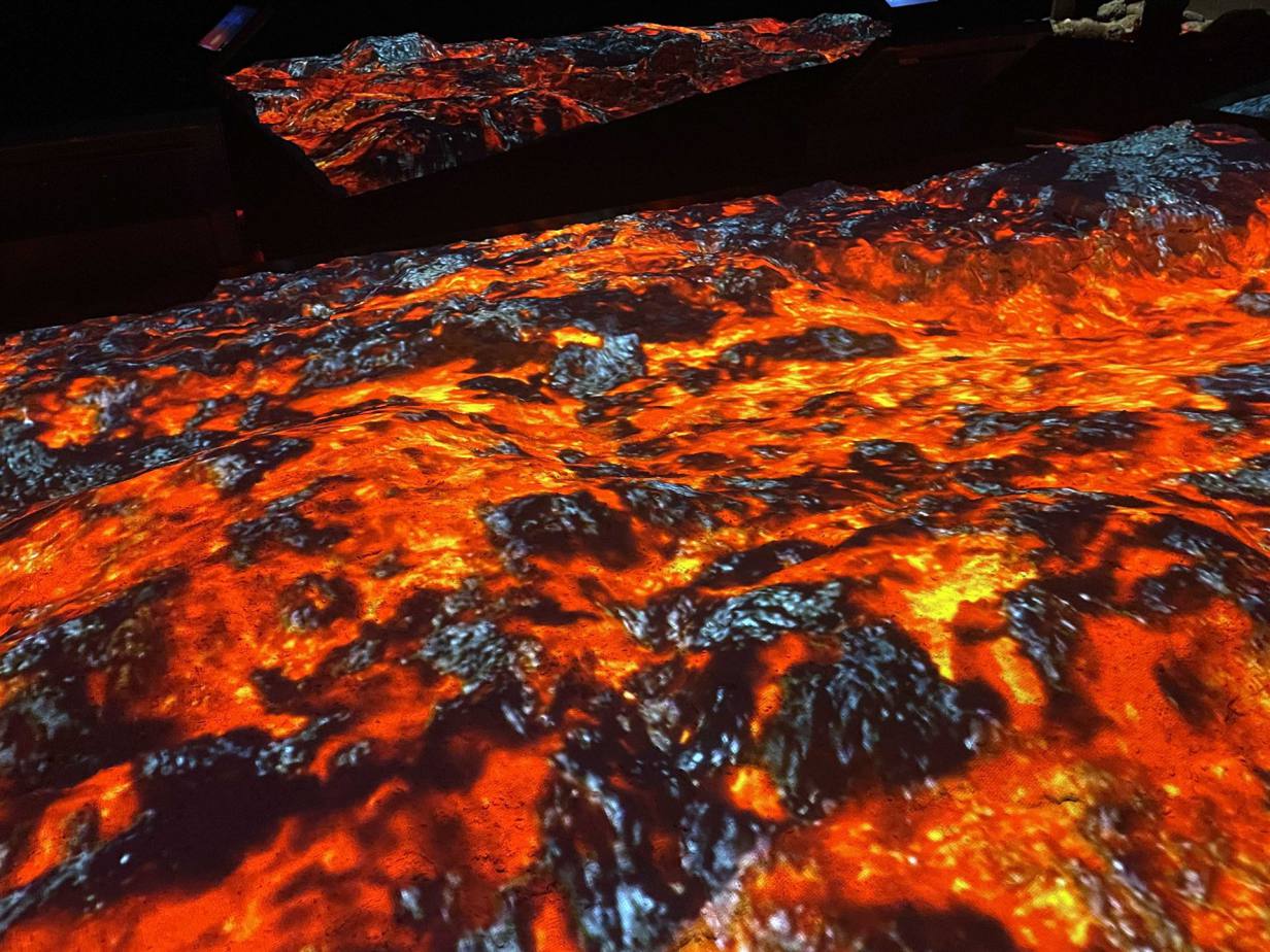 Der Eingang in die Ausstellung führt durch einen dunklen Gang, an dessen linker Seite leuchtend rote Lava entlangwabert. Natürlich keine echte Lava, aber der Effekt ist sehr beeindruckend und auch einfach schön anzuschauen.