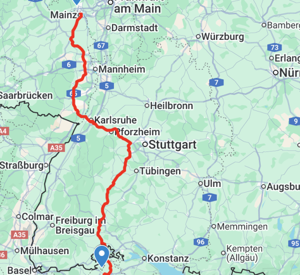 Heute Morgen um 10 Uhr war Start zur einmonatigen Reise mit Ziel Dänemark. Bei strahlendem Sonnenschein starteten wir in Embrach. Unterwegs gab es immer mehr wunderschöne weisse Wolken. Einmal gerieten wir kurz in eine Schauer, ansonsten ideales Sommerwetter mit 22°C. Mehrere kleine Staus waren kein Problem. Unterwegs haben wir noch kurz eingekauft gleichzeitig im Restaurant des Einkaufcenters das Mittagessen eingenommen. Keine gute Idee. Es war scheusslich. Gegen 16.30 Uhr erreichten wir Mainz. Der Stellplatz war schon voll. Der nette Platzwart gab uns aber noch einen nicht besonders schönen Platz am Eingang wo einige Anhänger standen. Da wir ja nur Schlafen wollten spielte das keine Rolle.