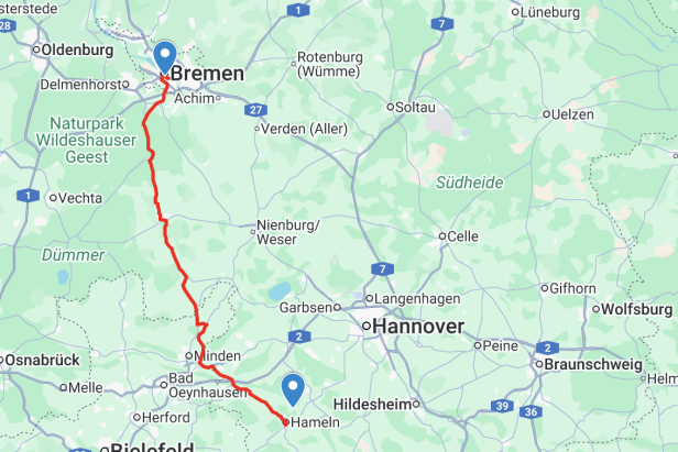 Der Rattenfänger von Hameln ist eine weltberühmte deutsche Sage aus dem Jahr 1284, die von den Gebrüdern Grimm aufgezeichnet wurde und die Geschichte eines Mannes erzählt, der eine Stadt von einer Rattenplage befreit, aber dann dafür keinen Lohn erhält. Daraufhin lockt er in Rache 130 Kinder mit seiner Flötenmelodie aus der Stadt und führt sie in einen Berg, wo sie verschwinden. Auf mehreren Etagensind neben der Geschichte des Rattenfängers auch noch Geschichten der Stadt zu sehen und zu lesen. Auf 1200 m2 wird die Geschichte der Stadt von den ersten Siedlungsspuren bis in die jüngste Vergangenheit gezeigt. Es ist interessant und kann nur empfohlen werden. Nach dem Mittag fuhren wir weiter gegen Norden. Der Weg führte über Land der Verkehr war problemlos. Wir sind auf den Stellplatz von Bremen gefahren. Anschliessend spazierten wir noch in die Stadt etwas mehr als ein Kilometer.