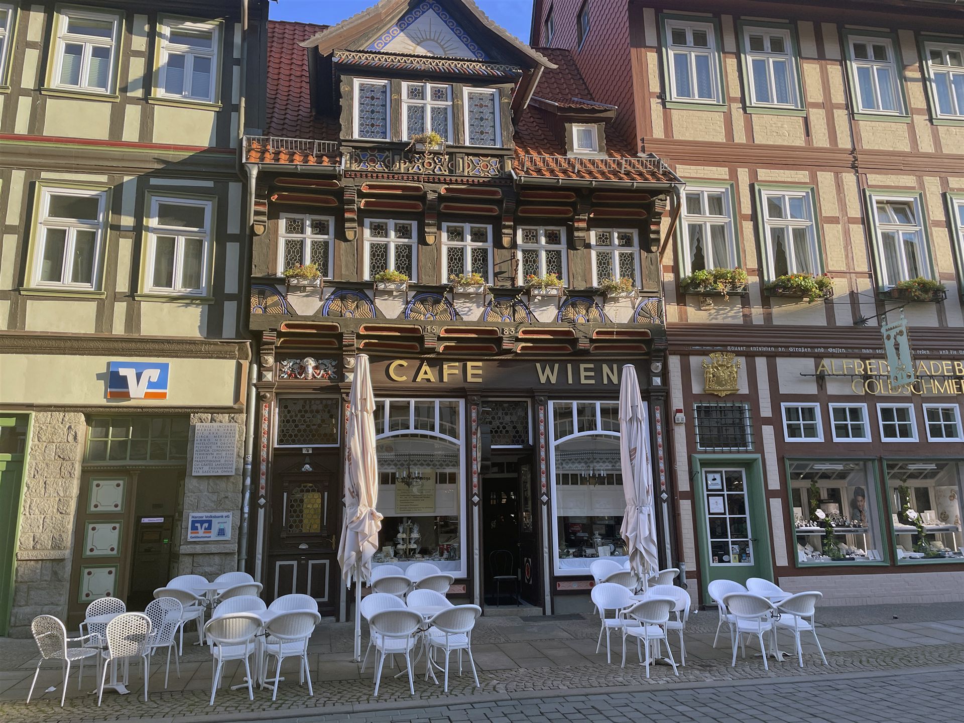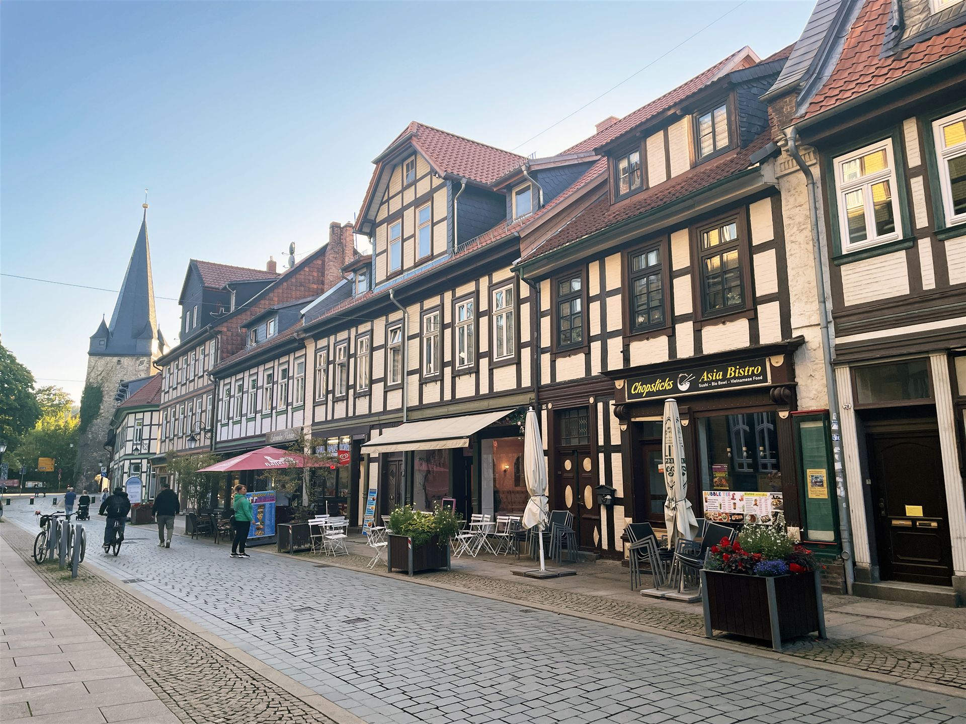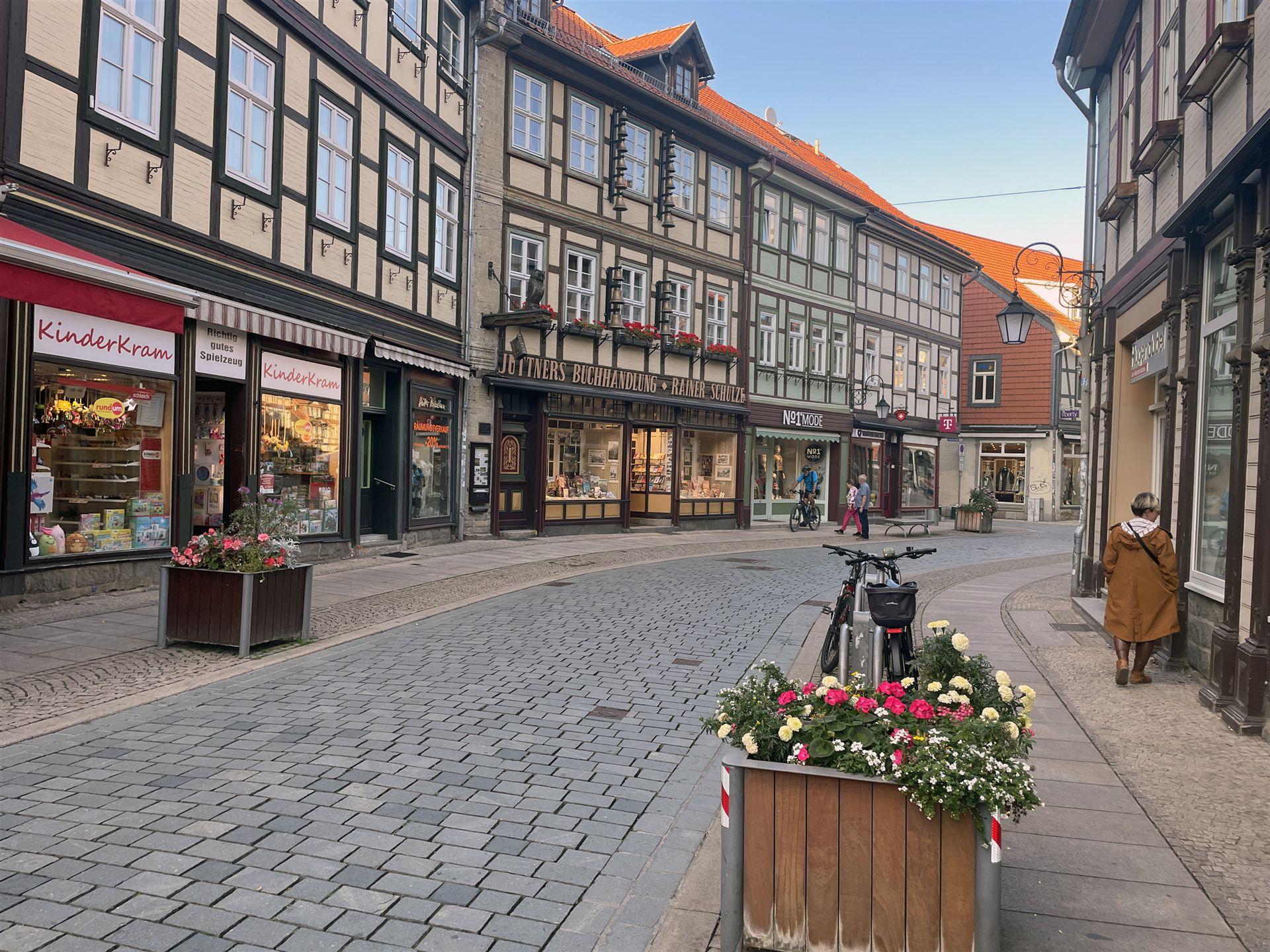 Der Platz war bis auf drei Buchten ausgebucht um 14.30 Uhr. Wir suchten nach dem Parken die Innenstadt auf. Der Stadtkern besteht zum großen Teil aus niedersächsischen Fachwerkhäusern. Das neugotische Wernigeröder Schloss thront markant über der Stadt und ist schon aus der Ferne gut zu erkennen. Auch die Umgebung von Wernigerode ist reizvoll: Hier startet die Harzer Schmalspurbahn, die über Schierke zum Brocken sowie quer über den Harz nach Nordhausen in Thüringen fährt. Es hat eine grosse belebte Fussgänger Zone. Wir haben Mittag gegessen und später auch von Kaffee und Eis genossen.