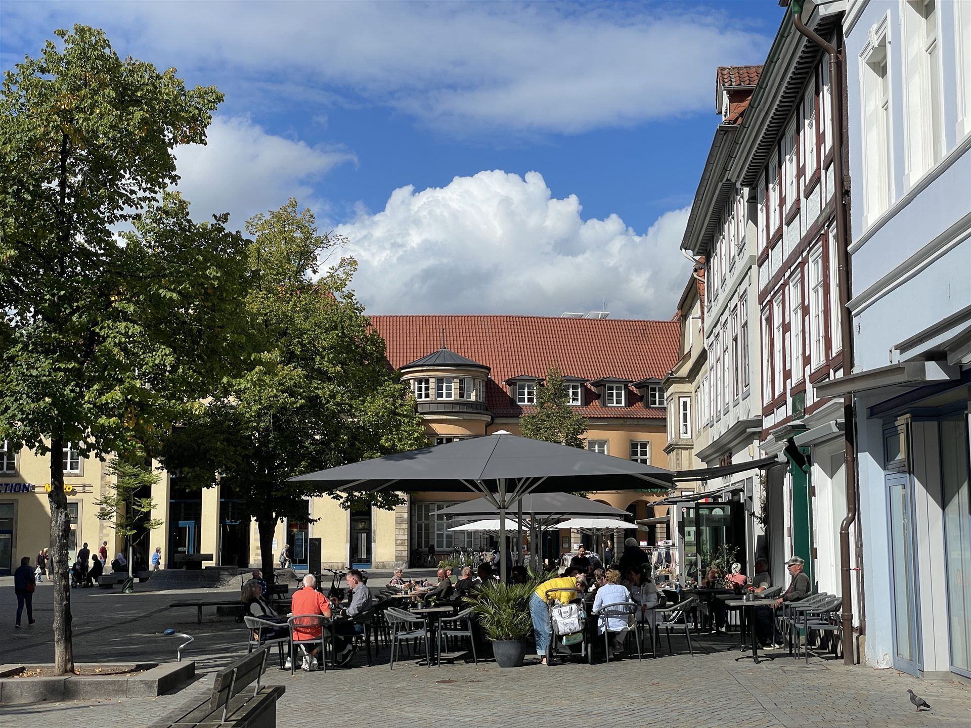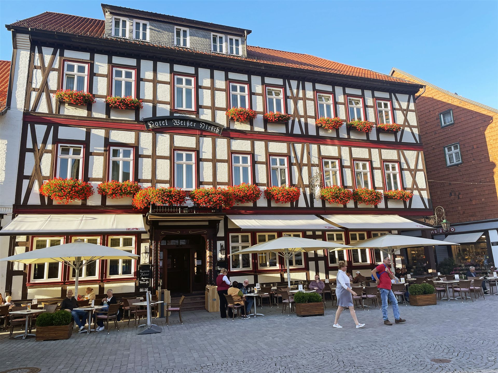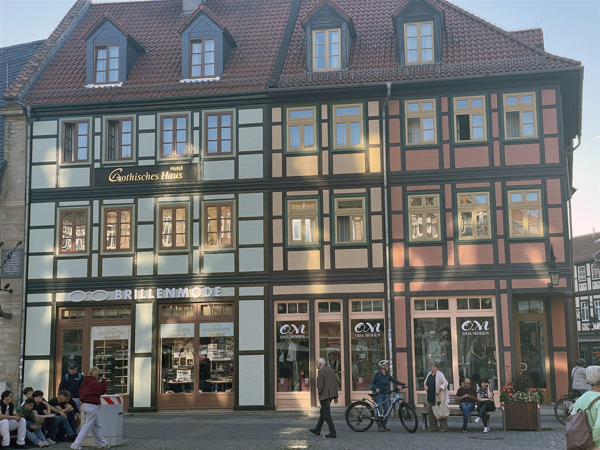 Der Platz war bis auf drei Buchten ausgebucht um 14.30 Uhr. Wir suchten nach dem Parken die Innenstadt auf. Der Stadtkern besteht zum großen Teil aus niedersächsischen Fachwerkhäusern. Das neugotische Wernigeröder Schloss thront markant über der Stadt und ist schon aus der Ferne gut zu erkennen. Auch die Umgebung von Wernigerode ist reizvoll: Hier startet die Harzer Schmalspurbahn, die über Schierke zum Brocken sowie quer über den Harz nach Nordhausen in Thüringen fährt. Es hat eine grosse belebte Fussgänger Zone. Wir haben Mittag gegessen und später auch von Kaffee und Eis genossen.