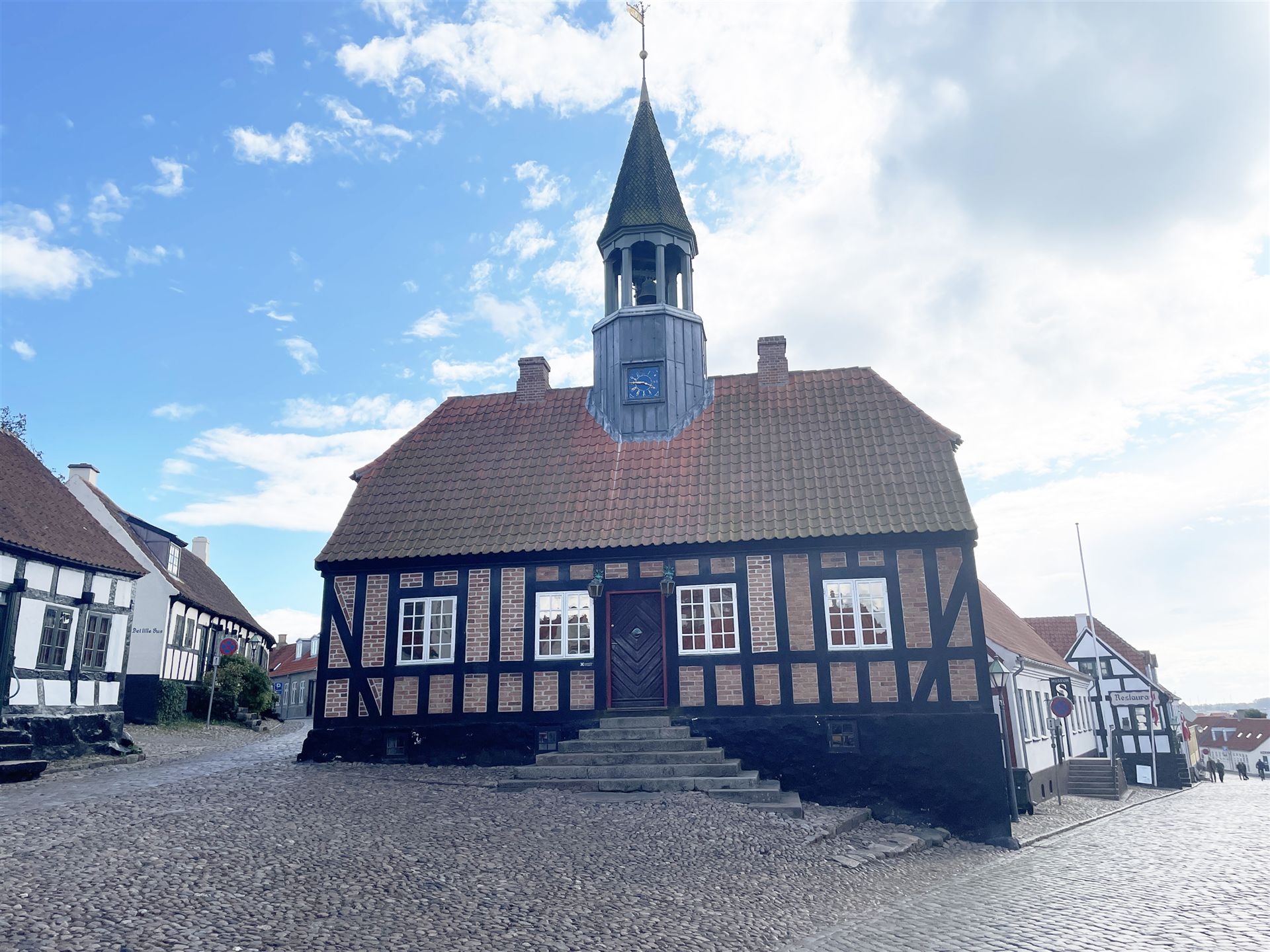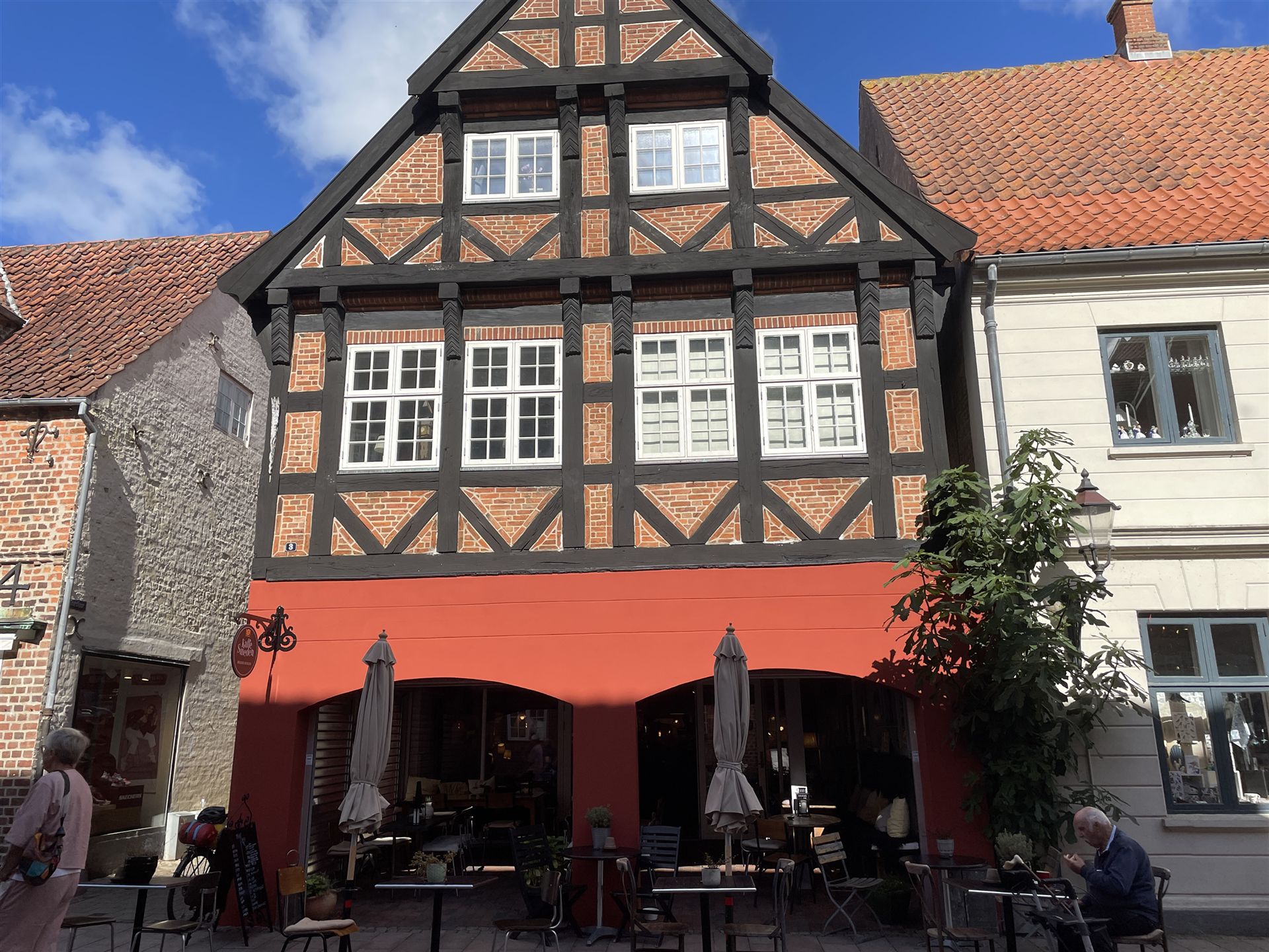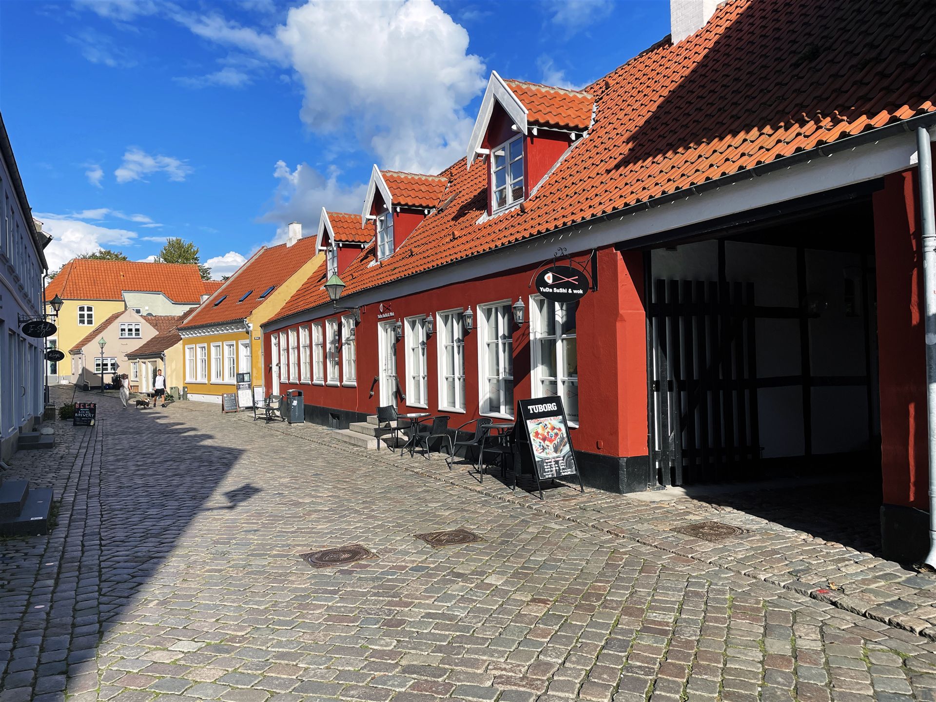 Eine ganz andere Atmosphäre zeigte sich in der Hafenstadt Ebeltoft. Wir konnten ganz nahe der Altstadt parkieren. In einem Restaurant am Hafen genossen wir seit lange wieder einmal guten Fisch. Ich liess mich aber zu einem Steack 250 g hinreisen. Voll genährt machten wir uns auf die Stadtbesichtigung. Der alte Stadtteil in Ebeltoft ist voller Nostalgie. Cafés, Restaurants und idyllische Geschäfte liegen malerisch in den engen mittelalterlichen Kopfsteinpflaster-Straßen zwischen Fachwerk-Häusern und Stockrosen. Die Stadt ist für ihr dynamisches Geschäftsleben mit lockenden Angeboten für jedermann bekannt. Es ist ein quirliger Ort wo sich die Touristen treffen und flanieren.