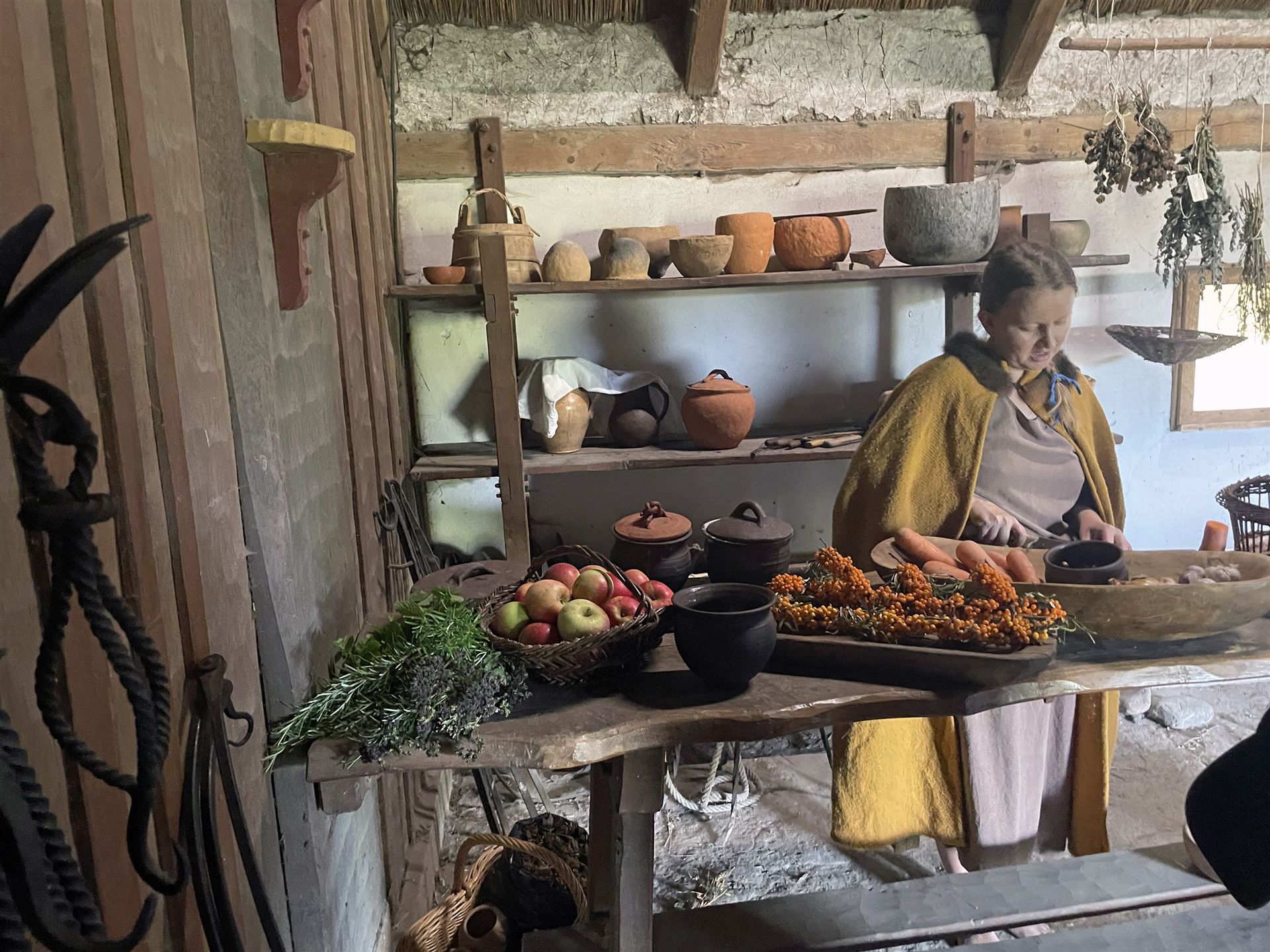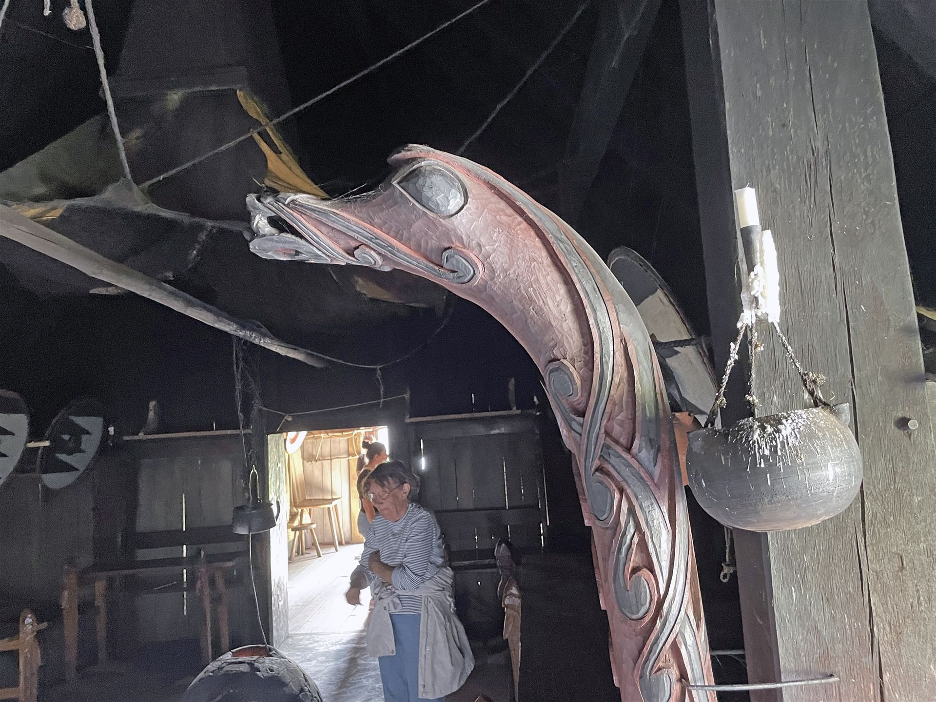 Ich möchte noch zwei spezielle Sachen hervorheben. Das Dorf hat eine herzige kleine Kirche. Die Konstruktion der Holzkirche basiert auf archäologischen Funden- sowohl lokalen als auch nordischen Funden. In der Kirche hängt eine Rekonstruktion des Kruxifixes von Aby, das einen siegreichen Christus mit offenen Augen und einer Königskrone auf dem Haupt zeigt. Man kann nur Staunen von der Handwerkskunst.