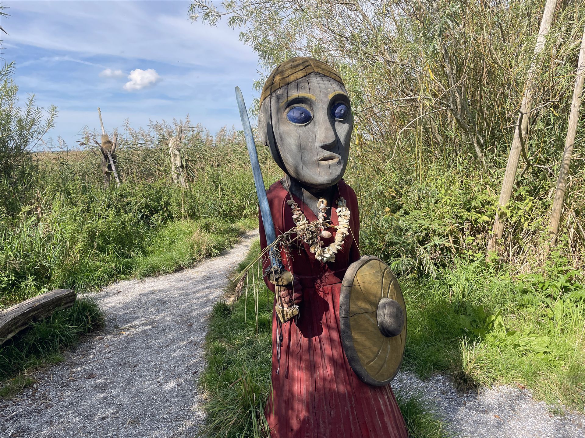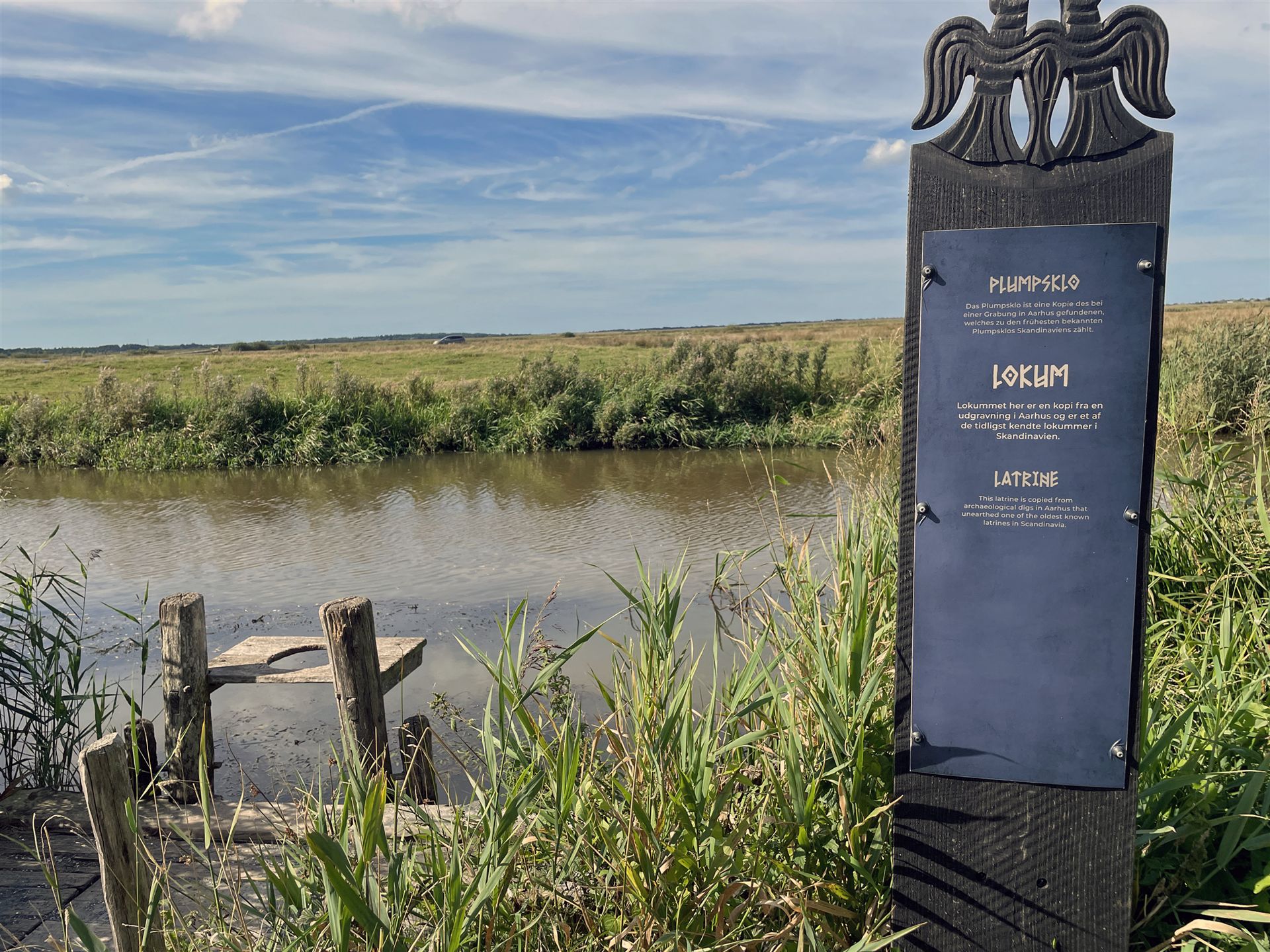 Wir spazierten noch auf einem Rundweg zur Ringburg. Die Fyrkatburg wurde im Jahr 980 unter König Harald Blauzahn errichtet. Keine der fünf ursprünglichen Ringburgen, die wir heute kennen, existiert mehr, aber auf Fyrkat markiert ein Erdwall, wo die Ringburg die ursprünglichen 16 Langhäuser umgab. Die Lage der Häuser ist heute mit weißen Steinen markiert. Direkt außerhalb der Burg wurde eines der Langhäuser rekonstruiert.