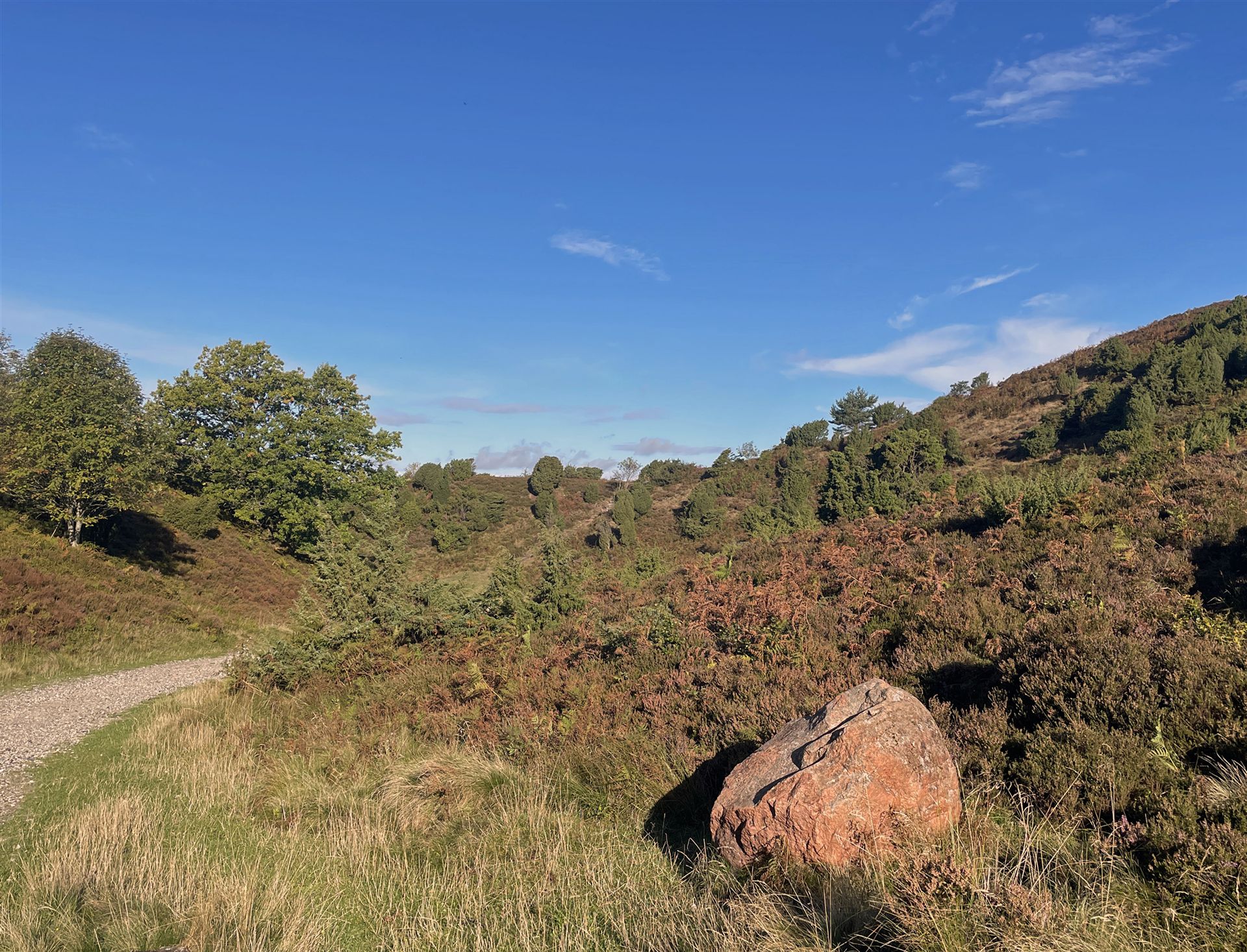 Wir benutzen die Morgenstunden zu einem Spaziergang in der interessanten Umgebung. Es gibt 3 verschiedene Routen. Wir wählten die 3.6 km. Die Wege sind hügelig und links und rechts von grossen Hügeln gesäumt. Die Region umfasst den Rold Skov, einen der größten Wälder Dänemarks, sowie die mit Heidekraut bewachsenen Hügel von Rebild Bakker. Es gibt eine große Auswahl an markierten Wanderwegen, die sich in Länge und Schwierigkeitsgrad unterscheiden. Viele Wege bieten informative Schilder, die Geschichten über die Geschichte und Geologie der Region erzählen, und es gibt zahlreiche Möglichkeiten, die reiche Tierwelt zu erleben. Unserer Weg wurde dann tatsächlich doppelt so lang, da wir an einer Verzweigung uns von den weissen Pfeilen irritieren liessen und dadurch nach links liefen. Der Ranger machte uns gestern Abend noch darauf aufmerksam dass dort der richtige Weg nicht markiert ist.