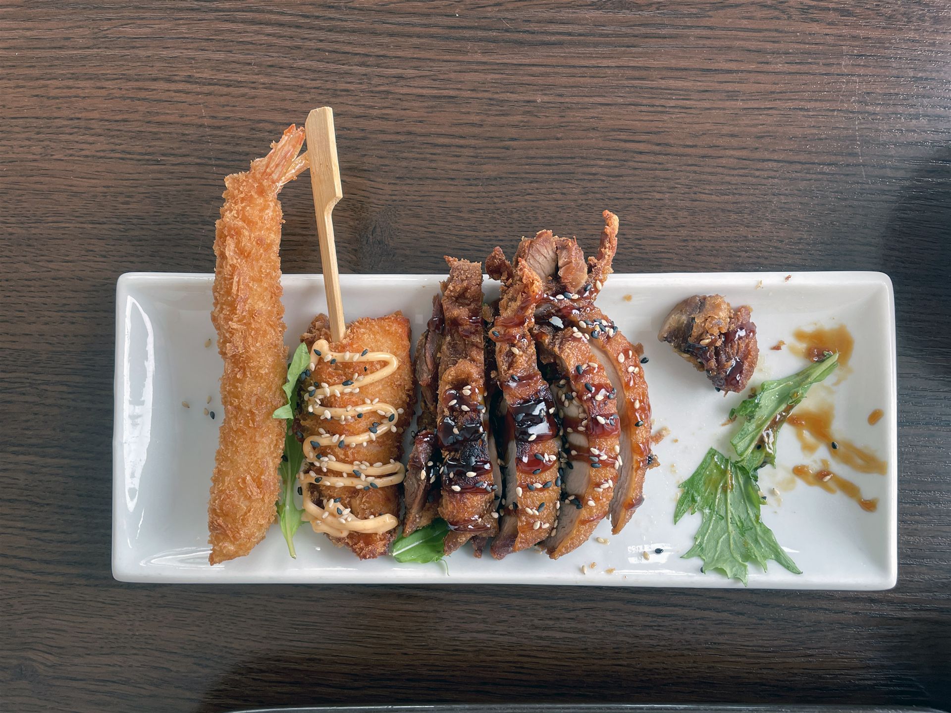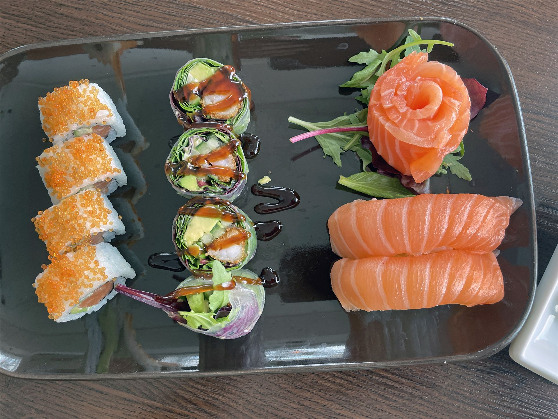 Wir fuhren dann noch zu unserem Übernachtungsplatz im Haven von Grenaa. Da wir noch nichts gegessen hatten spazierten wir einige 100 m weit Richtung Stadt. Dort fanden wir als erstes ein Sushi Restaurant. Wir waren noch nie in so einem Lokal und mussten und helfen lassen zu bestellen. Das geht alles über Tablett. Ichc stellte mir mit Hilfe der Besitzerin etwas zusammen. Tuulia nahn ein einfaches Menü mit Poulet. Und so sah meine Bestellung aus ....