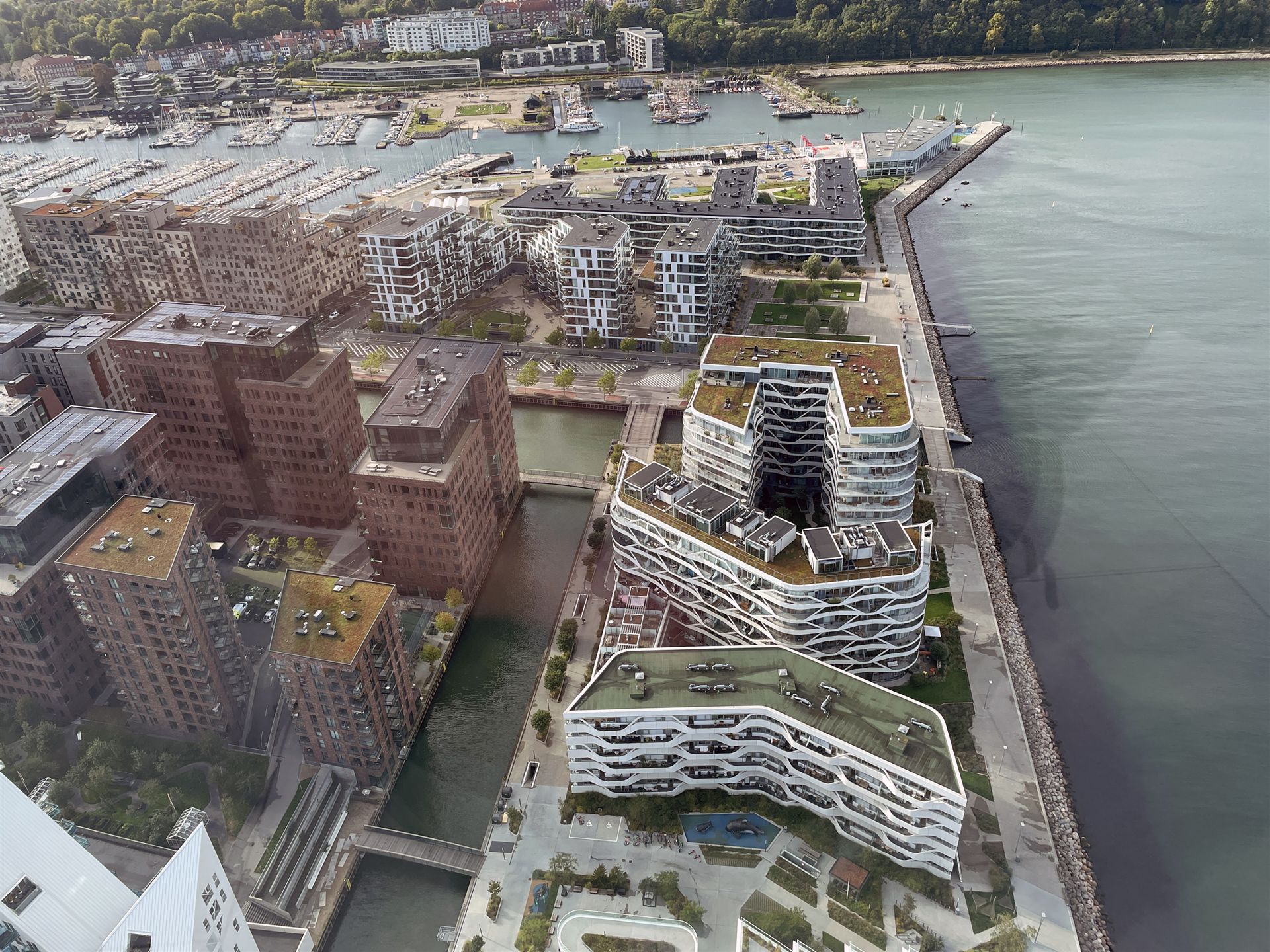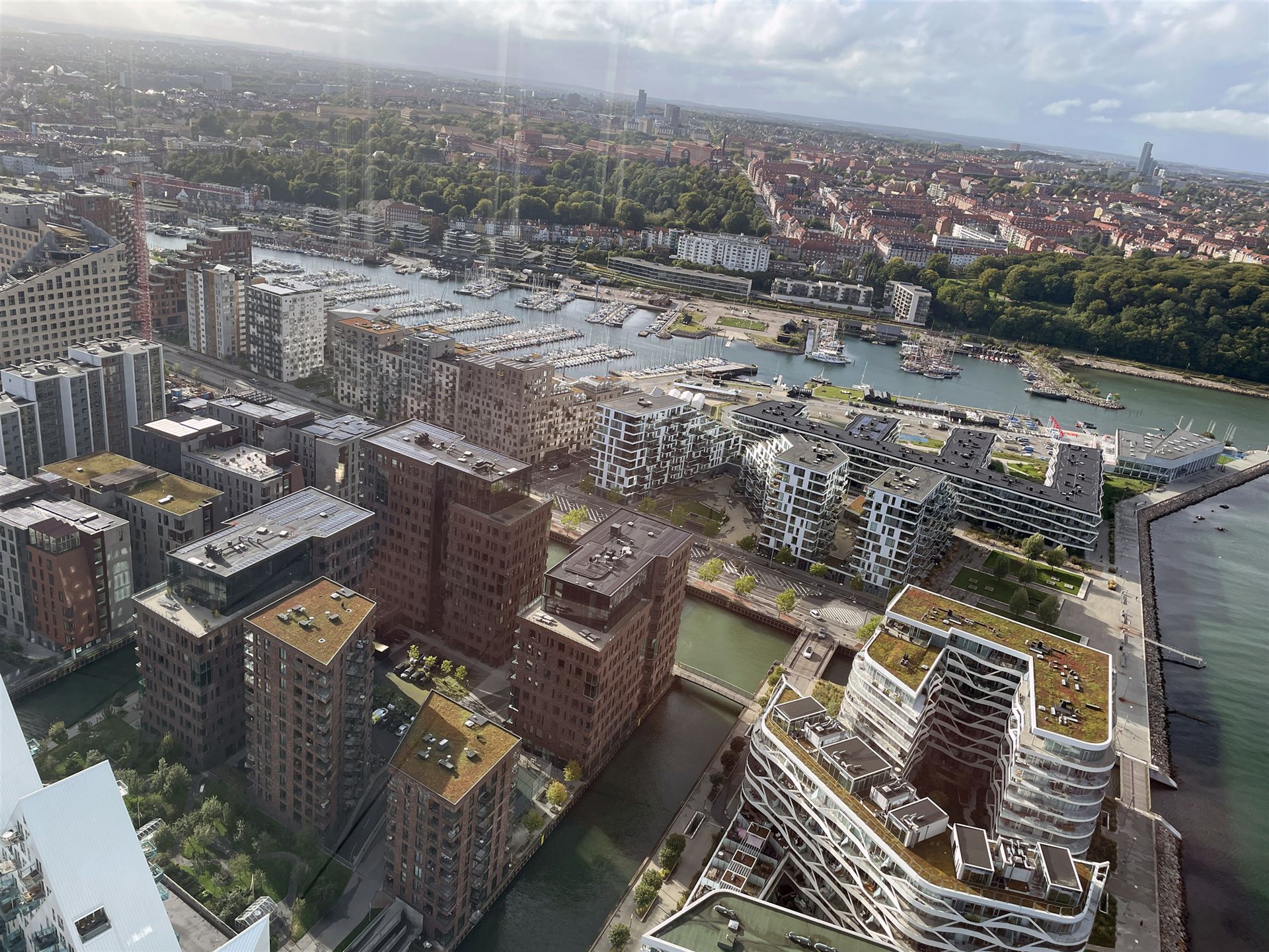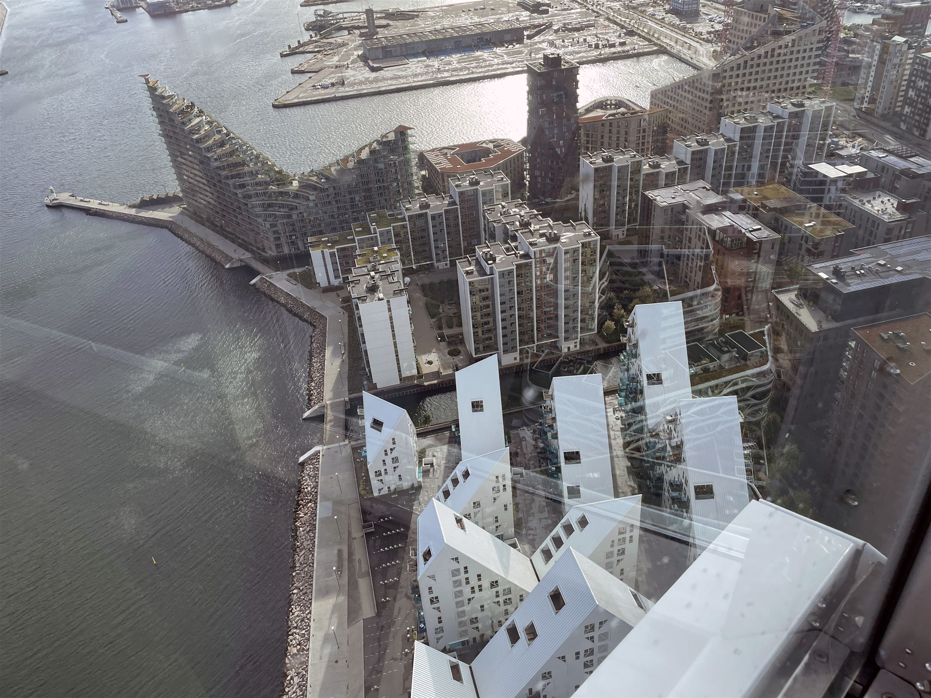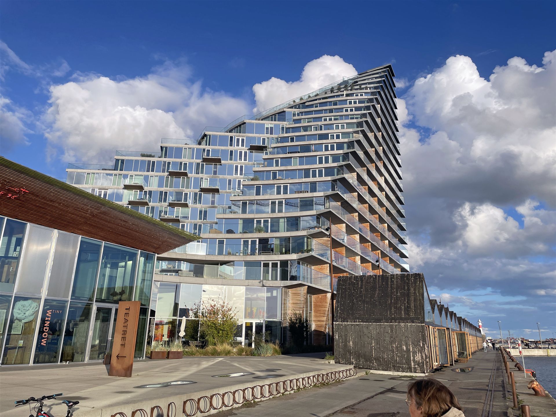 Am Himmel wurde es wieder verdächtig schwarz. Es war Zeit das trockene Wohnmobil aufzusuchen. Leider reichte es nicht ganz. Die letzten Meter wurden wir noch nass. Der Spuck war schnell wieder vorbei und die Sonne zeigte sich wieder. Wir spazierten nochmals durch die wunderschöne Neustadt am Hafen. Ich benutzte die Gelegenheit den höchsten Turm zu besichtigen wo man eine der atemberaubendsten Aussichten Dänemarks erleben kann. Man steigt in den Hochgeschwindigkeitsaufzug (Schindler) und ist in weniger als 30 Sekunden auf der Spitze des Aarhus Øje, 142 Meter über dem Boden. Im Lighthouse leben Jung und Alt, Kinder und Erwachsene Seite an Seite am Wasser. Fast die Hälfte des Gebäudes besteht aus Glas (46 %) und verfügt über beeindruckende 2.512 Türen. Das Bauwerk steht auf rund 1.700 Pfählen, darunter 28 Betonpfähle mit einer Tiefe von 70 Metern und einer massiven, 2 Meter dicken Betonplatte.