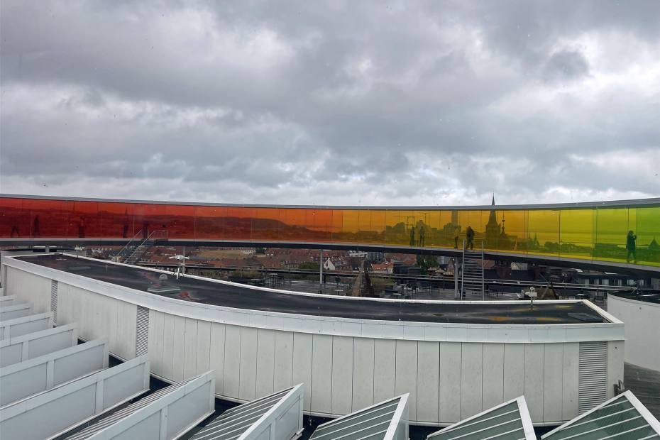Die Skulptur Your rainbow panorama auf dem Dach des Aarhuser Kunstmuseums ARoS war für mich das Highlight des Gebäudes. Man kann hier das riesige, farbenfrohe Kunstwerk des dänisch-isländischen Künstlers Olafur Eliasson sehen. Über eine Treppe bzw. mit Hilfe eines Aufzugs wird der runde aus Glas gestaltete in allen Farben des Lichtspektrums erstrahlende Panoramaweg mit einem Durchmesser von 52 Metern zugänglich. Man bekommen dann auf den 150 Metern eine Rundumsicht über die gesamte Stadt.