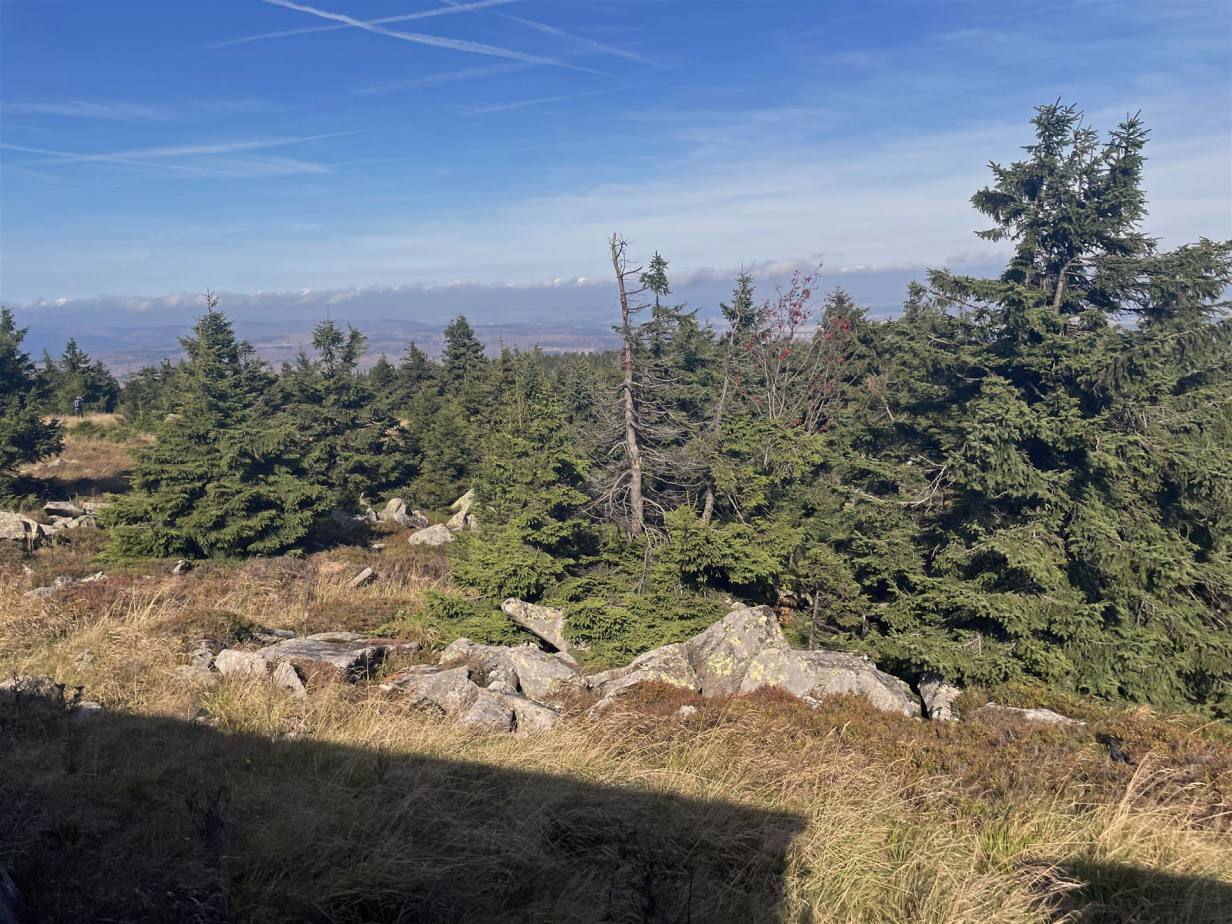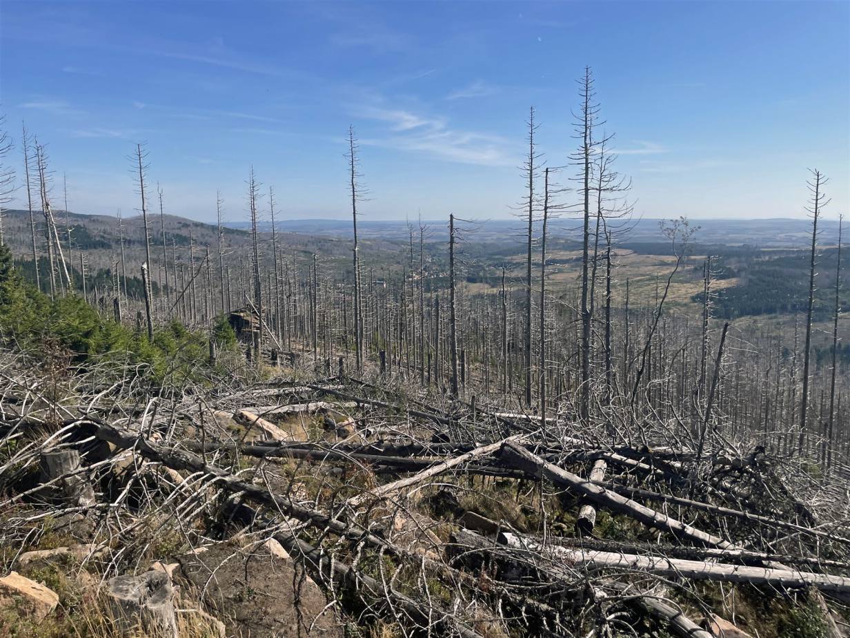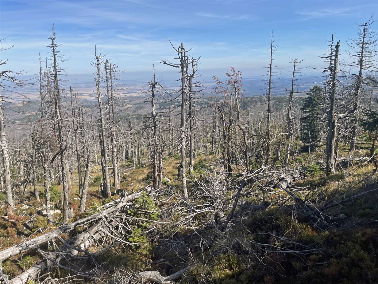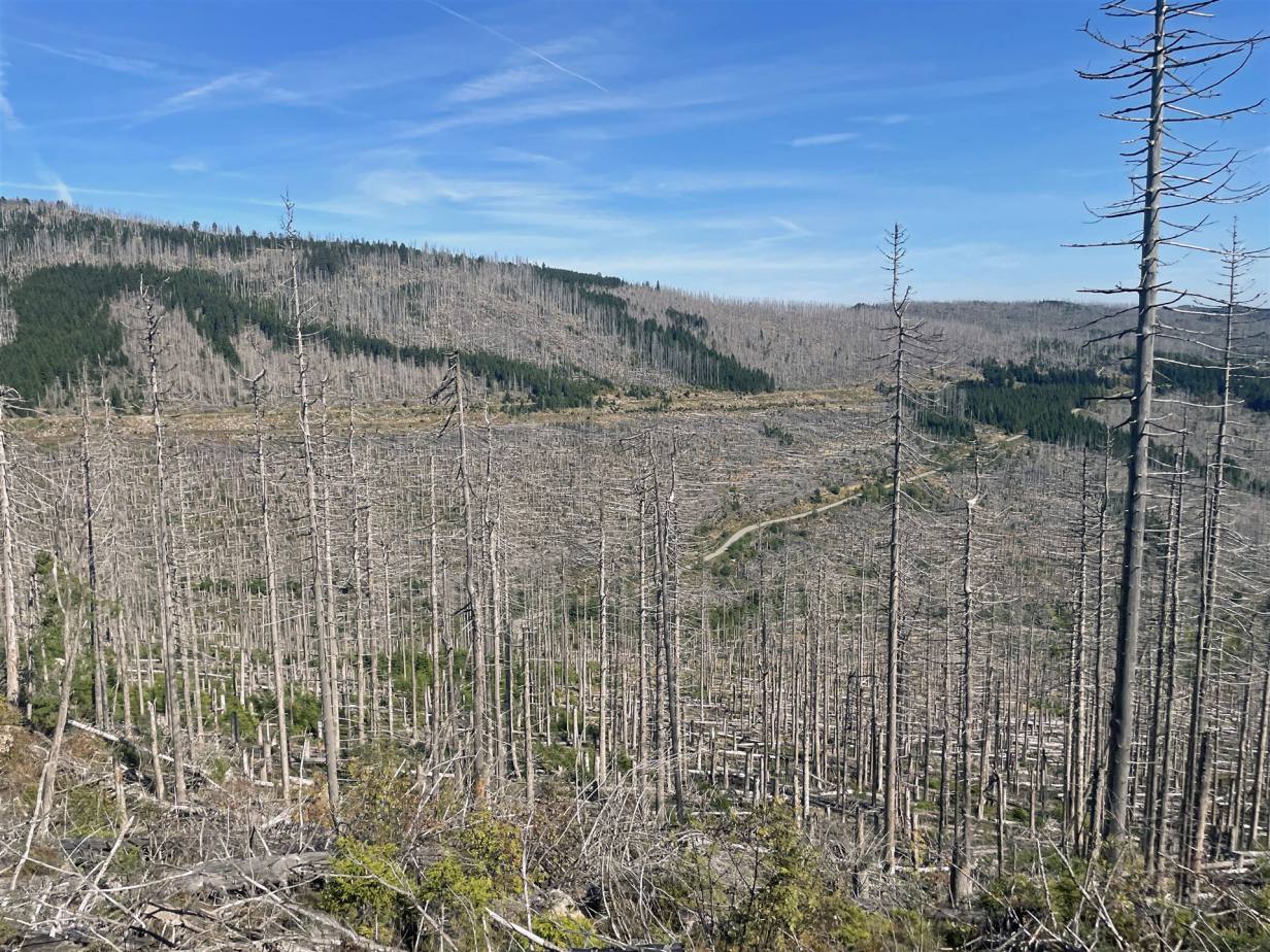 Ich habe mir ein Billette gekauft um auf den Brocken zu fahren. Die Fahrt dauerte 11/2 Stunden. Die Dampflok schnaubte den Berg hinauf. Der Zug war voll, die Leute standen die ganze Strecke. Man kam sich wie eine Sardine in der Büchse vor. In der Mitte der Strecke tritt eine Phänomen in Sichtweite das einem zu Denken gibt, Riesige Flächen mit abgestorbenen Bäumen. Aber auch grosse Flächen ohne Bäume als in den 30-er bis 60-er Jahren abgeholzt. Also Hauptverantwortlicher ist der Mensch. Der Klimawandel und die zu trockenen Jahre waren für die Vermehrung der Borkenkäfer verantwortlich, die die geschwächten Bäume befielen.