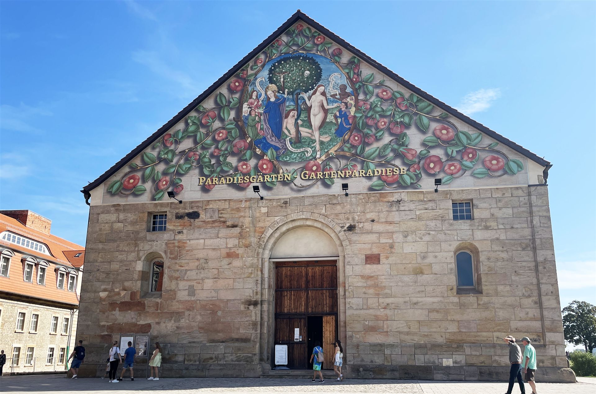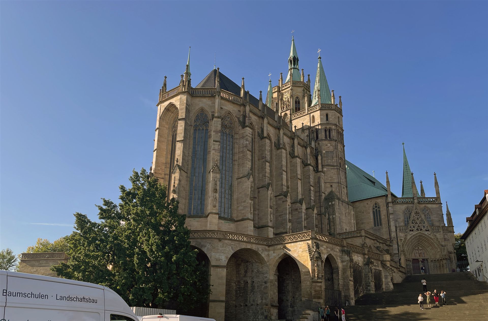 Über eine 70-stufige Freitreppe gelangt man vom Domplatz auf den Domberg mit seinen beiden ehemaligen Stiftskirchen. Der Dom mit hochgotischem Chor, romanischem Turmbereich und spätgotischer Westhalle ist Nachfolger des 724 von Rom veranlassten Sakralbaus. Er war die Hauptkirche des 742 von Bischof Bonifatius gegründeten Bistums Erfurt. Im Innenraum sind die gotischen Chorfenster, das umfängliche Chorgestühl (14. Jhd.) sowie die romanischen Skulpturen einer thronenden Madonna und eines monumentalen Kerzenträgers besonders sehenswert. Im mittleren Turm befindet sich die weltweit größte mittelalterliche freischwingende Glocke, die "Gloriosa".