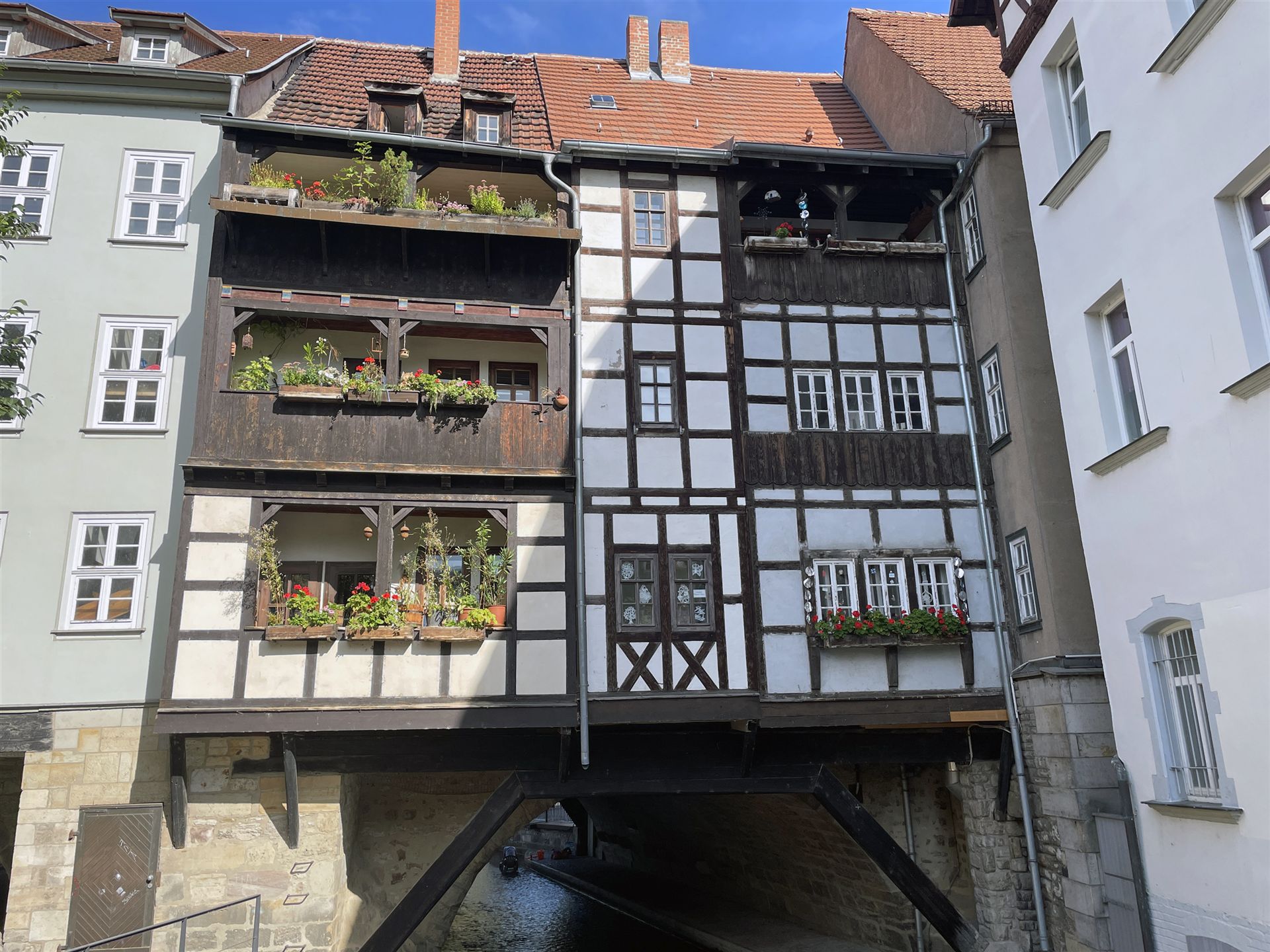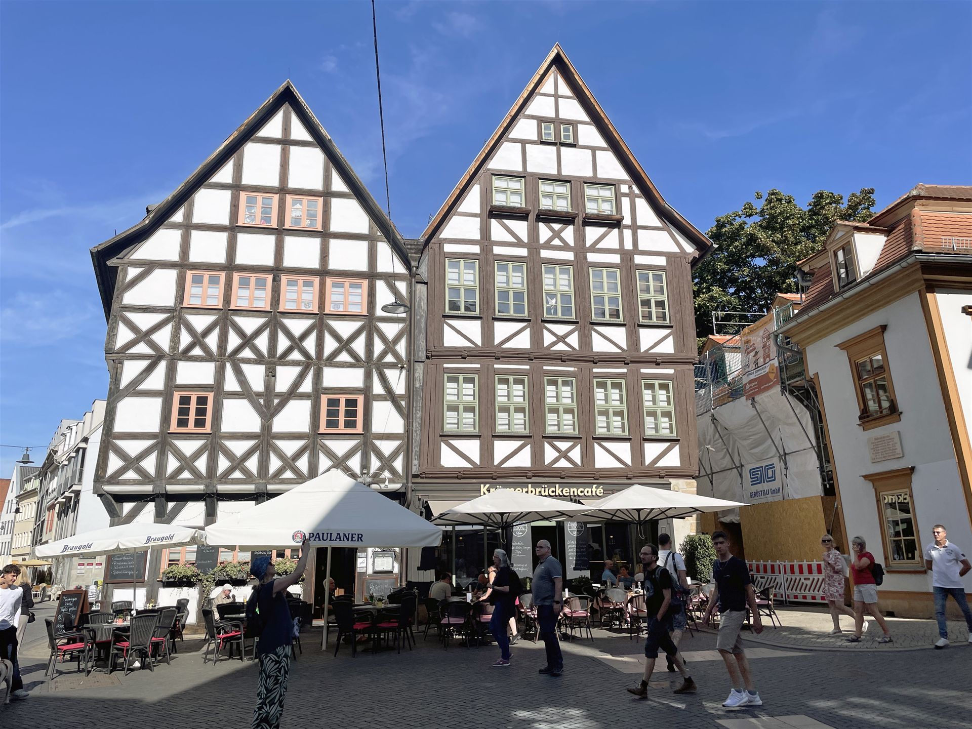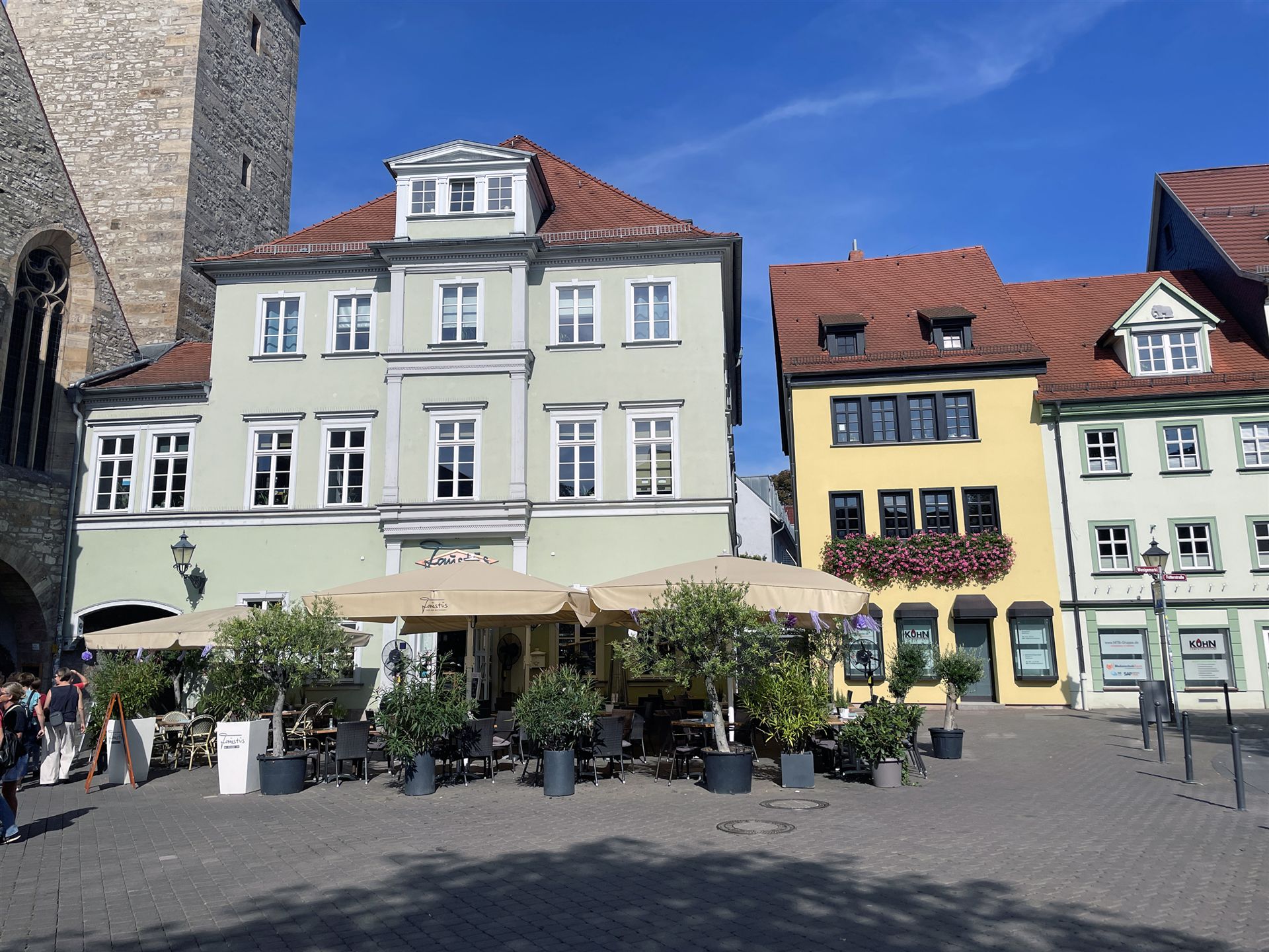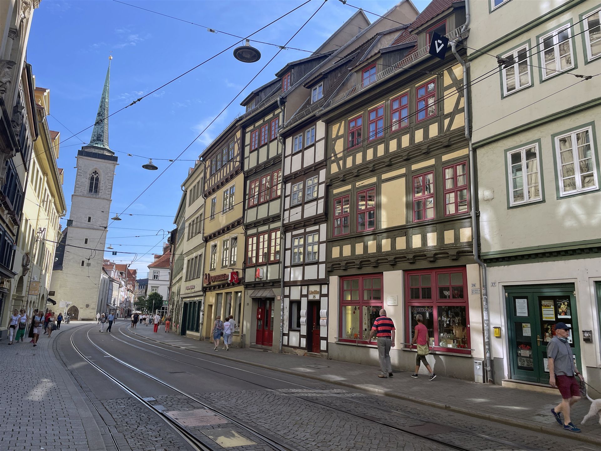 Am Morgen konnten wir 5 Min vom Platz die Strassenbahn in die Stadt nehmen. Die Tickets habe ich im Büro der Information am Platz bekommen. In weniger als 15 Minuten ist man Mitten in der Stadt. Für Erfurt sollten Sie sich Zeit nehmen, denn die Stadt ist mehr als eine Reise wert. Erfurt ist nicht nur die größte Stadt Thüringens. Erfurt ist auch eine äußerst beeindruckende und sehenswerte Stadt im Herzen Deutschlands. Nicht umsonst sagte bereits Dr. Martin Luther: Erfurt „liegt am besten Ort. Da muss eine Stadt stehen". Die Wahrzeichen der Stadt sind das Ensemble von Dom St. Marien und der St. Severi Kirche, die Krämerbrücke und imposante Kirchen. Wenn man zur Strassenbahn aussteigt wird man fast vom Dom erschlagen. Imposant thront der Dom und die Severi Kirche etwas erhöht über der Stadt.