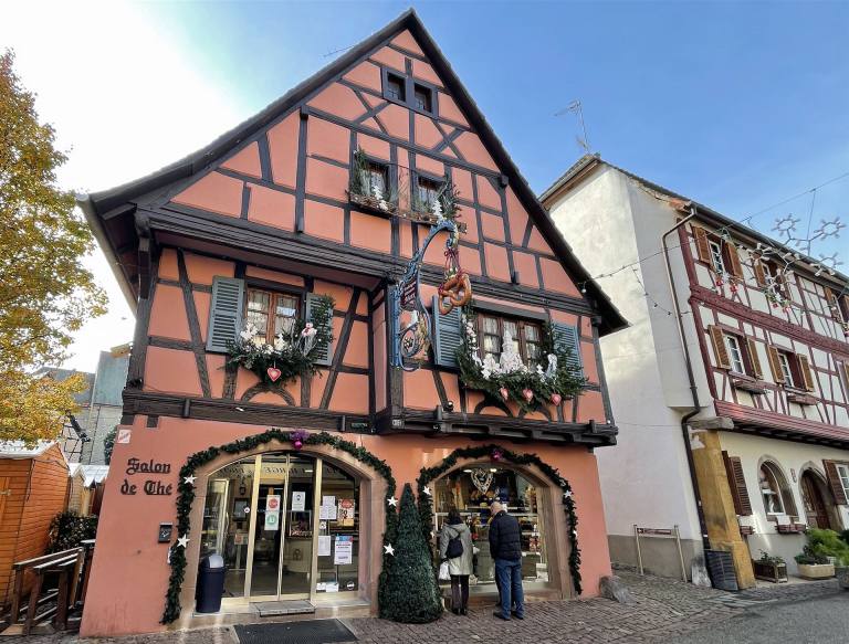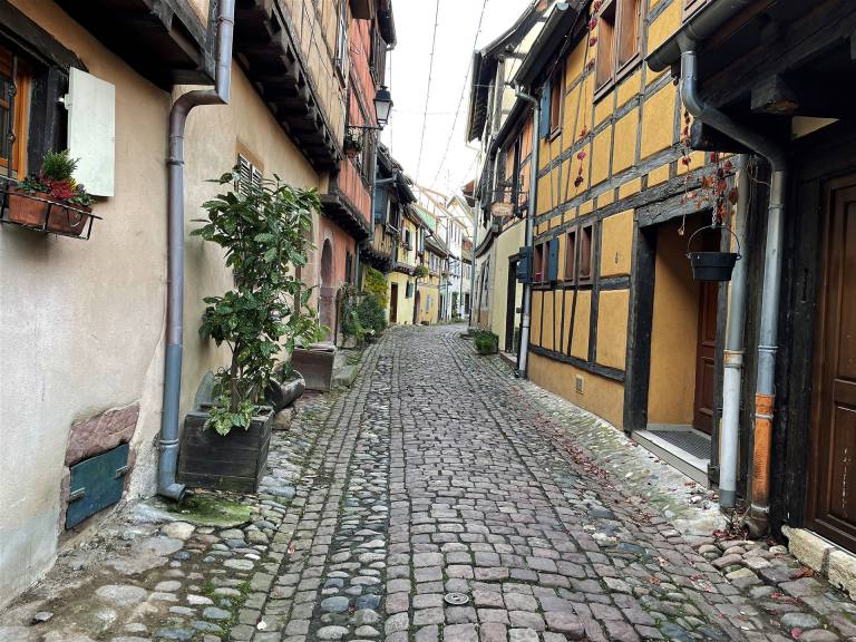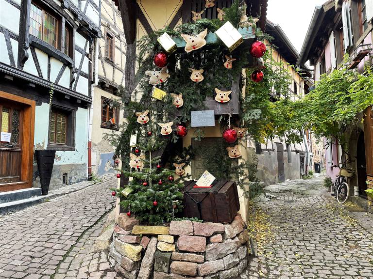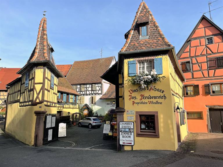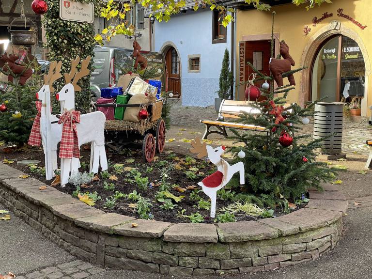 Heute besuchen wir zwei Weinorte in der Umgebung. Der erste Ort war Eguisheim im Elsass ein romantischer Weinort. Er liegt mitten zwischen den elsässischen Weinbergen und ist daher die auch die Heimat vieler Winzerbetriebe. Hier werden mit dem Eichberg und der Pfersigberg gleich zwei der besten Weine der Region produziert. Der Ort liegt etwas 6 km von Colmar entfernt und ist mehrfach als schönstes Dorf Frankreichs ausgezeichnet worden. Und das mit Recht. Der Ort wurde 1257 gegründet. Wir parkierten auf dem neuen Parkplatz am Dorfrand. Dabei sahen wir einen neuen wunderschönen Wohnmobil Stellplatz. Wir spazierten durch den Ort und konnten die wunderschönen Häuser bewundern. Ein charmantes kleines Dorf, typisch elsässisch mit den alten Gebäuden und ihren Spitzdächern, bunten Farben und Fachwerkfassaden. Dieses mittelalterliche Dorf gefällt durch seine bescheidene Größe, seine einzigartige Architektur, seinen Blumenreichtum im Sommer, aber auch durch seinen authentischen Charme zur Weihnachtszeit, wenn rund um den Weihnachtsmarkt viele Aktivitäten angeboten werden.
