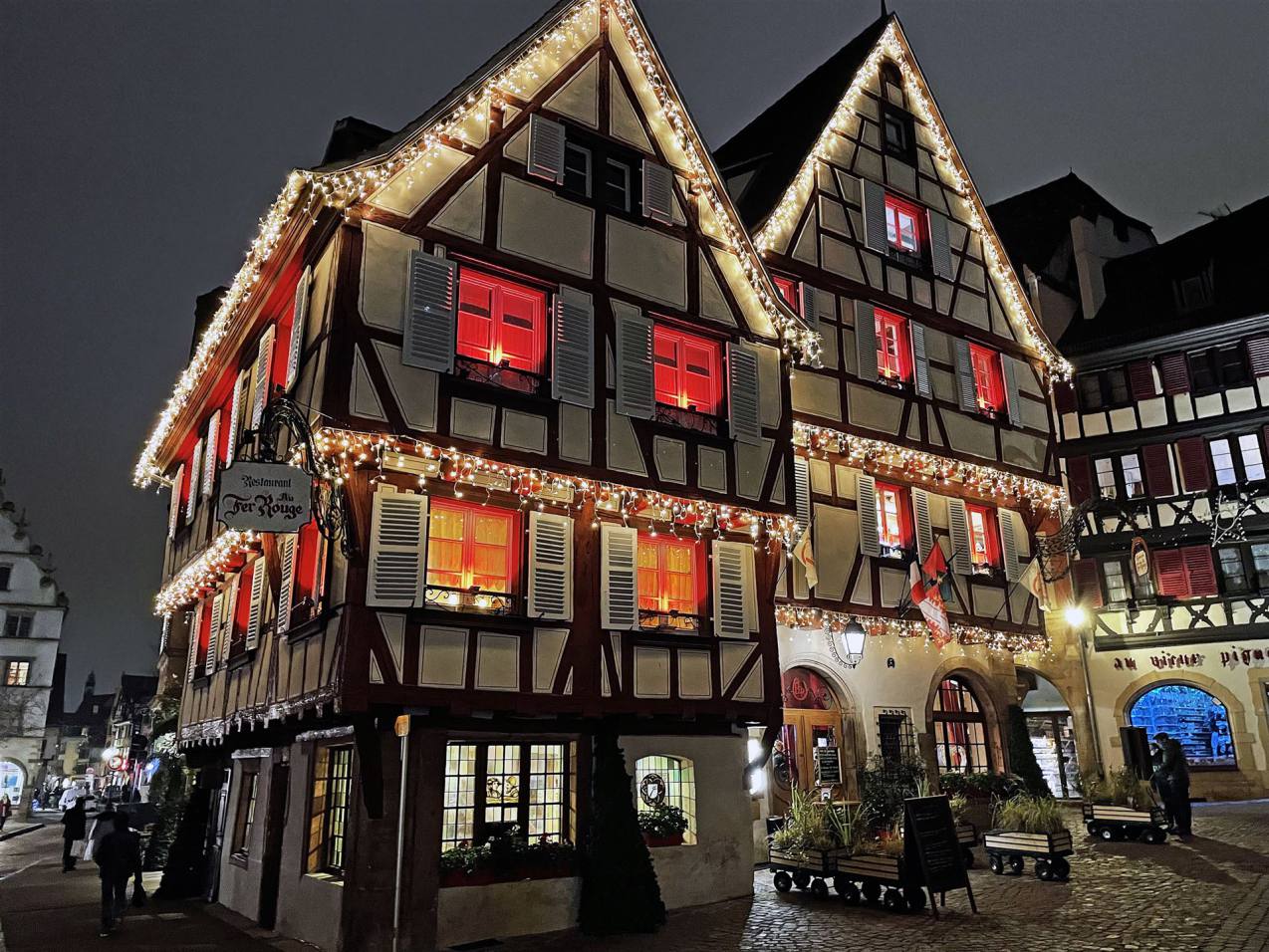 Anschliessend ging es weiter nach Riquewihr. Das Städtchen mit seinen Fachwerkhäusern aus dem 13. bis 18. Jahrhundert ist ebenfalls wunderschön. Riquewihr – so stellt man sich einen malerischen Ort in den Weinbergen vor: romantische Gassen, historisches Kopfsteinpflaster und schöne Fachwerkhäuser. Umgeben wird Riquewihr aber nicht nur von Weinreben, sondern auch von einer mittelalterlichen Mauer. Im Ortskern gibt es mit unzähligen Restaurants und Weinkellern viele gute Gründe zum Schlemmen und Genießen! Wir genossen die wunderschönen Häuser und machten einen Halt in einem Kaffee. Tuulia genoss eine Tasse Kaffee mit einem Gebäck. Wir nahmen den Anlass zu einem Aperitiv was in den Weindörfern auch ausgeschenkt wird. Wir genossen den guten Weisswein. Nach vielen weiteren Schritten ging es in ein urtypisches Restaurant. Unsere Reise war aber noch nicht beendet.