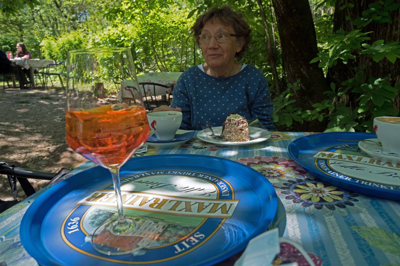 Schon am Morgen überraschte uns ein wolkenloser Himmel. Gemäss Wetterbericht soll es angenehme 23°C werden. Wir machten uns auf den Weg und wählten zuerst den falschen Weg. Nach einigen hundert Metern kamen uns Zweifel. Gut hat man ein Iphon mit Apps zur Hand. Schnell sahen wir, dass wir den Weg wieder zurück laufen mussten. Schlussendlich waren wir dann auf dem richtigen Weg. Vom Campingplatz aus geht es zügig bergauf bis zum kleinen Montiggler See. Der Kleine Montiggler See ist rund 400 Meter vom Montiggler See entfernt und liegt ein paar Höhenmeter oberhalb. Wunderbar naturbelassen ist das fast 900 Meter lange Ufer rund um den See. Meist ist es zugewachsen. Viel Wald umgibt die rund 5 Hektar große Wasserfläche. An den Ufern findet man viele kleine natürliche Badeplätze. Ein Restaurant oberhalb des Sees ladet zur Rast ein. Wir nutzen das Angebot zumal noch etliche Tische im Schatten frei waren. In der Selbstbedienung holte ich mir ein Aperol Spritz als Aperitiv. Tuulia einen Kaffee mit einen schönen Stück Kuchen. Kostenpunkt der ganzen Einkehr 9.00 €. Für Schweizer Verhältnisse unglaublich.