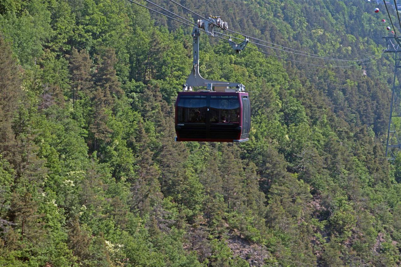 Da es bereits Mittagszeit war suchten wir uns ein nettes Restaurant. Auf der guten Speisekarte wählte Tuulia Congnilio mit Polenta und ich ein gutes Stück Fleisch mit gerösteten Kartoffeln. Wir machten noch einen Verdauungsspaziergang und sahen noch ein grosses Sportgeschäft das einen grossen gedeckten Platz hatte. Beim schlendern entdeckten wir Schuhe, die wir schon lange suchten. Tuulia fand auch noch eine Handtasche. So haben wir nebst dem Ausflug auch gerade noch eingekauft. Anschliessend nahmen wir die Bahn wieder zurück. Von oben ist die Bahn noch imposanter wenn man dann den Berg herunterschaut.