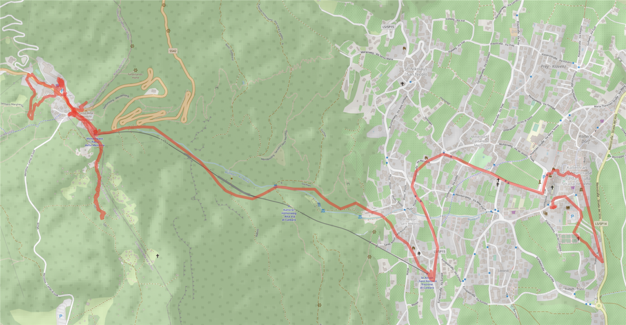Wir machten noch einen Verdauungsspaziergang und in der wunderschönen Landschaft auf dem Mendelpass. Der Pass verbindet auf 1363 m Höhe das Überetsch bei Eppan (zur Provinz Bozen-Südtirol gehörend) mit dem Nonstal (Provinz Trentino) und führt westlich weiter nach Fondo. Er stellt damit auch seit alters die Sprachgrenze zwischen deutsch auf Südtiroler Seite und italienisch im Trentino dar. Wir machten uns auf den Weg zur Bergstation, wo wir nur kurz warten mussten. Die Bahnstrecke von oben aus gesehen ist schon atemberaubend. Unten angekommen stand der Bus bereits bereit und brachte uns noch in das Städtchen Kaltern.